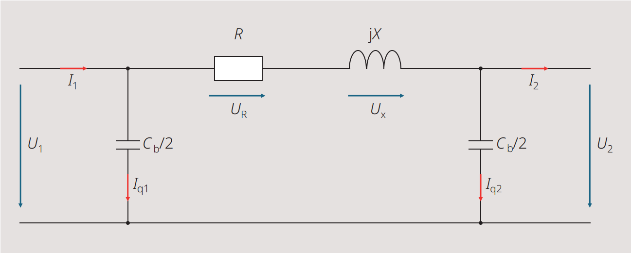 Zur Veranschaulichung dieses Effekts kann das PI-Ersatzschaltbild eines Leitungsabschnitts herangezogen werden (Bild 1). Wird bei konstanter Belastung die Betriebsspannung erhöht, reduziert sich der Strom I2, wodurch die Längsverluste (Wirk- und induktive Blindleistung in R bzw. X) sinken. Gleichzeitig steigen die kapazitiven Ströme Iq1 und Iq2 und damit die Querverluste (kapazitive Blindleistung), da bei konstanter Kapazität Cb der Strom mit zunehmender Spannung ansteigt. Wie stark sich die Blindleistungsbilanz verändert, hängt wesentlich von der Leitungstechnologie (Kabel oder Freileitung), von der Netztopologie sowie von den gewählten Spannungsniveaus ab.