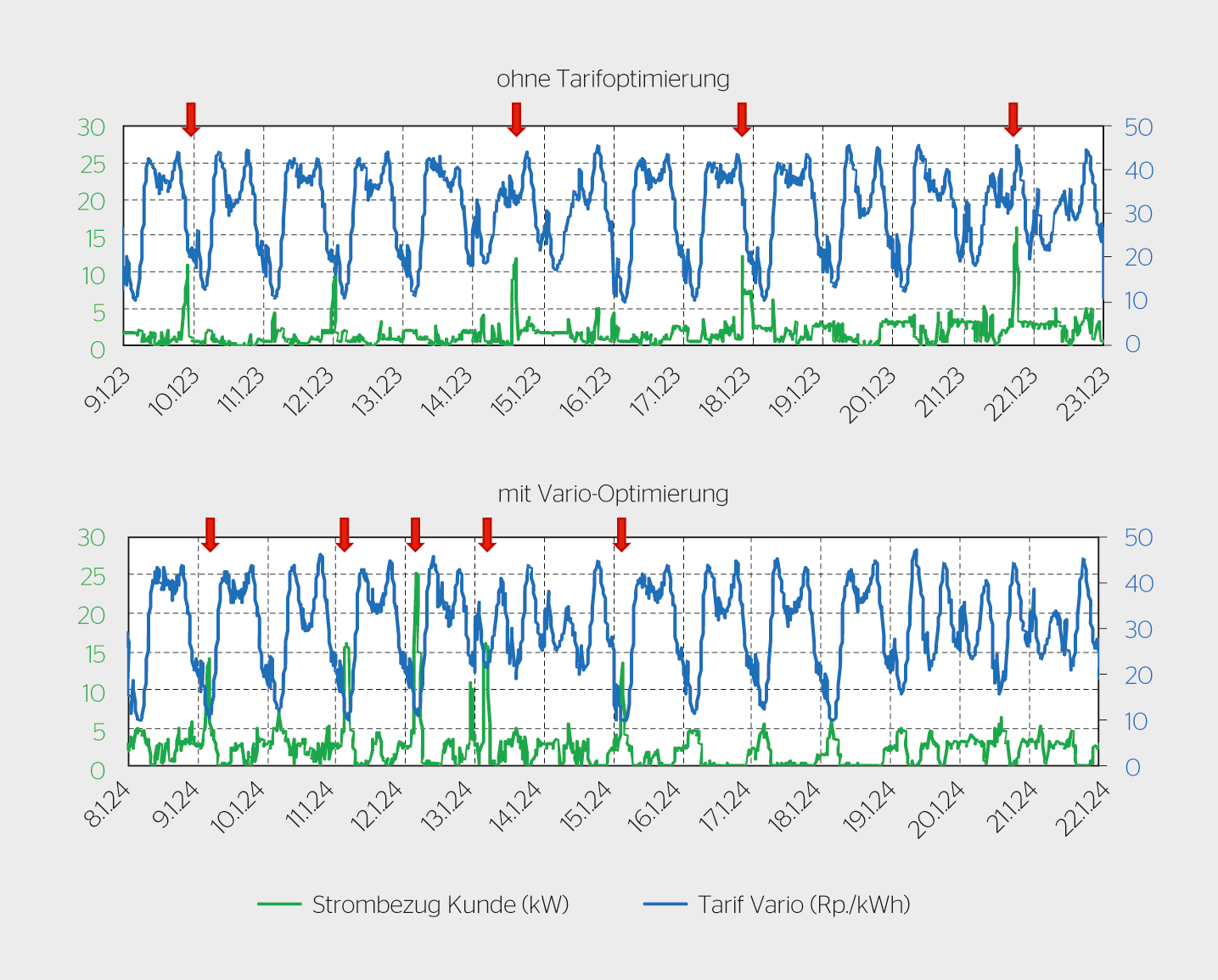 Bild 3 zeigt die Strombezugskurve und die Bezugsspitzen eines Kunden ohne Tarifoptimierung und mit der Vario-Optimierung. Die Strombezugsspitzen fanden ohne Optimierung meistens am Abend statt, zu Zeiten mit hoher Netzlast und wurden durch die Optimierung vom Kunden in die nächtlichen Stunden mit der tiefsten Netzlast verschoben. Der Kunde hat dadurch seine Stromkosten gesenkt und die Netzlastspitzen reduziert.