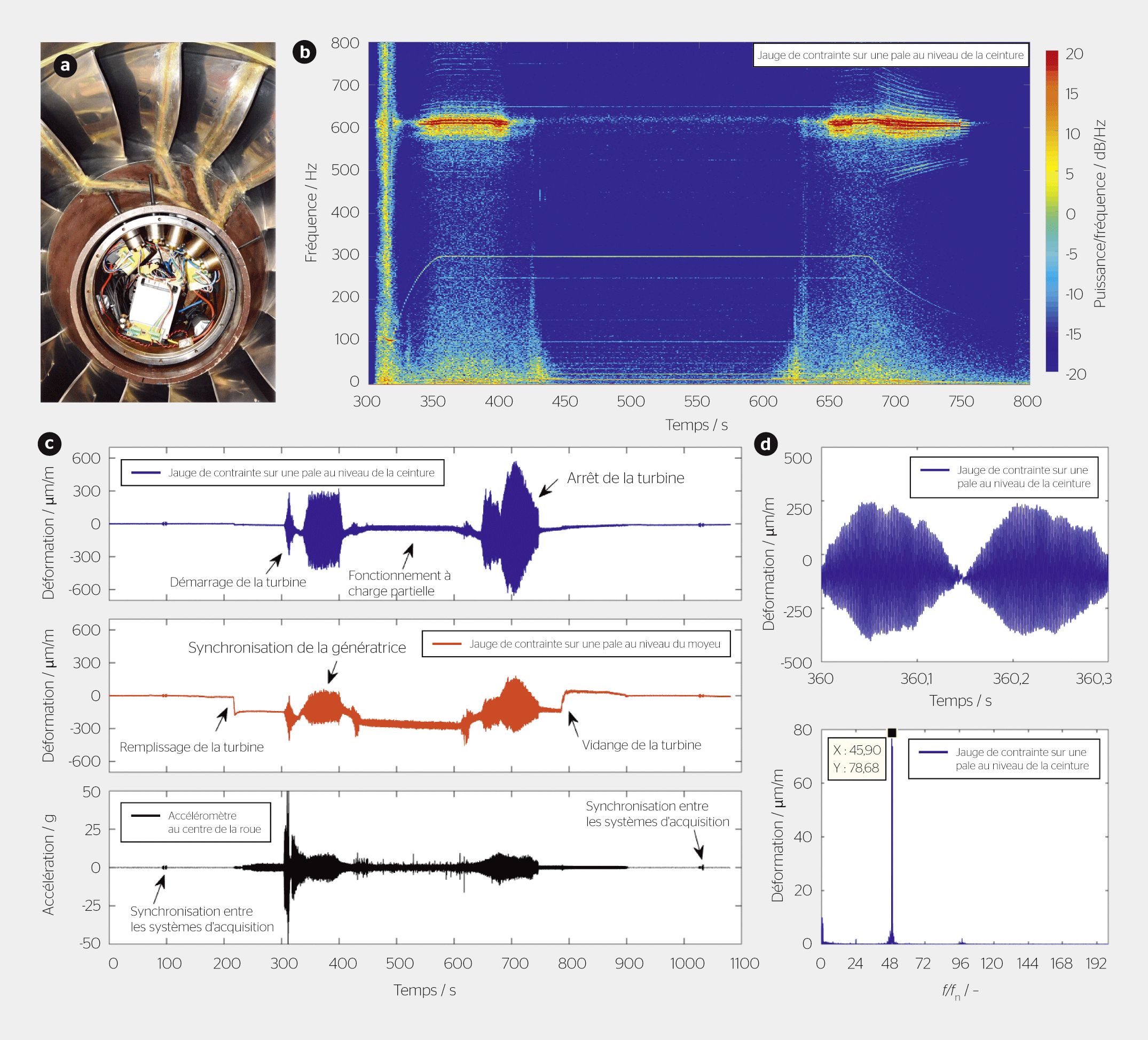 Des jauges de contrainte ont été fixées sur 4 pales, dans l’objectif de placer l’instrumentation aussi près que possible de la zone des fissures observées au pied des pales de la roue de la turbine (figure 2a). Une chambre spécialement conçue pour les mesures embarquées a été installée au centre de la roue pour accueillir un système d’acquisition autonome et ses batteries munies d’une électronique de protection contre la décharge profonde. L’instrumentation a été complétée avec deux accéléromètres et deux tachymètres inductifs installés dans la même enceinte.