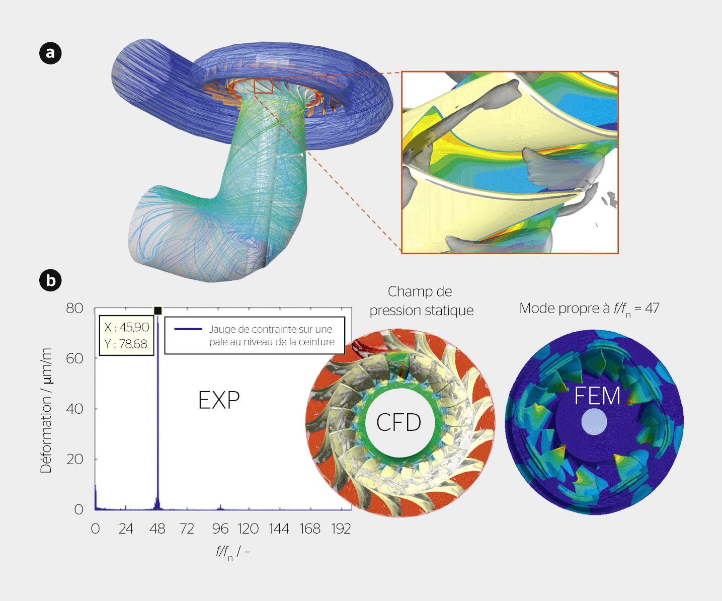 - Une analyse modale, dont l’objectif est de déterminer les fréquences propres et les modes de la roue dans son environnement (roue noyée et en rotation).