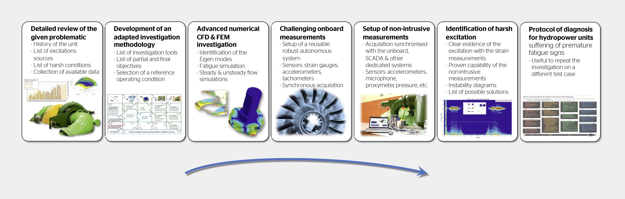 Grâce à cette étude, un protocole de diagnostic pour les centrales hydroélectriques présentant des signes de fatigue prématurée a été élaboré (figure 4). Dans un premier temps, les données historiques monitorées dans la centrale doivent être analysées pour identifier l’origine potentielle des problèmes observés. Ensuite une campagne de mesures sur site doit être organisée, en prévoyant des mesures non intrusives dans les parties fixes à plus haute fréquence que le monitoring quotidiennement utilisé. Si nécessaire, des mesures embarquées peuvent être envisagées. En parallèle, des simulations numériques fluide et structure de la machine doivent être réalisées. Après validation des résultats au point nominal, les plages de fonctionnement potentiellement critiques seront investiguées. Grâce à une analyse détaillée des résultats obtenus par ces différentes approches, des solutions pour limiter le temps de fonctionnement aux points d’opération critiques peuvent être testées, puis implémentées de manière durable dans la centrale.