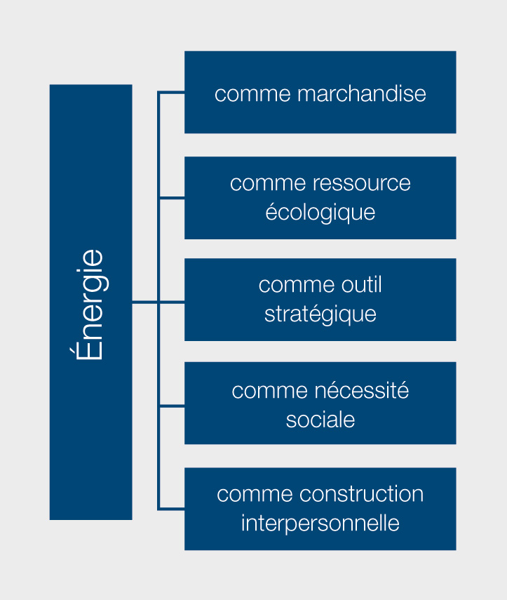 - L’énergie comme marchandise intègre l’énergie dans une compréhension économique et commerciale.