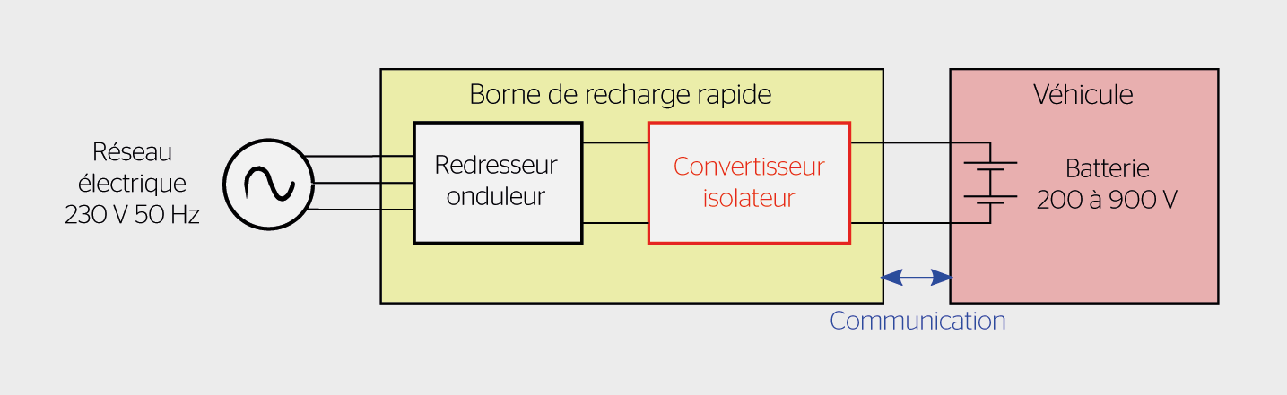 Les chargeurs à courant continu assurent trois importantes fonctions distinctes de conversion de la puissance. Premièrement, ils convertissent la tension alternative du réseau en courant continu, qui est ensuite injecté dans la batterie du véhicule. Deuxièmement, pour la sécurité des utilisateurs et des équipements, ils assurent une isolation galvanique entre le réseau électrique et les conducteurs du câble relié au véhicule. Et, troisièmement, ils règlent le courant de charge de la batterie pour qu’il suive à tout instant la consigne donnée par le système de gestion de la batterie du véhicule, de sorte à recharger cette dernière de manière optimale.