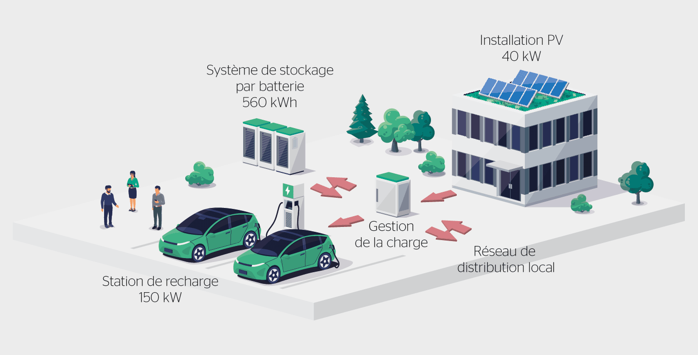 Avec l’augmentation du nombre de voitures électriques en Suisse, le réseau électrique est de plus en plus sollicité. Or, les pics de charge pourraient être évités si les stations de recharge étaient contrôlées en fonction du réseau, en tenant compte de la production et de la consommation locales, et si elles étaient complétées par des systèmes de stockage d’énergie par batterie.