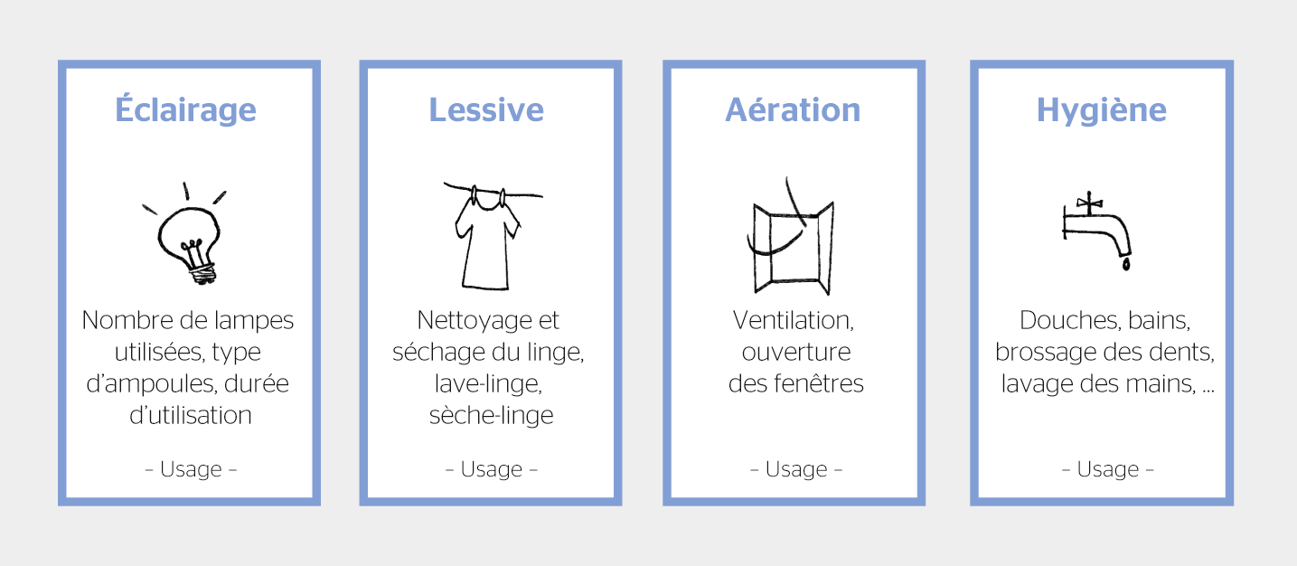 Ils deviennent actifs et codesigners du service énergétique. Ils ont bien souvent perdu le lien avec l’énergie primaire et sont de passifs consommateurs de services automatisés. Dans le cadre des activités du LL, ils retrouvent un rôle actif de co-designers, au côté des spécialistes. Un jeu sérieux a également été développé dans le cadre du projet UserGap financé par l’OFEN: le «poker design de l’énergie». Après avoir réalisé des entretiens qualitatifs avec les parties prenantes, des personas, sortes de caricatures des acteurs du système, ont été créées. Il y a le distributeur d’énergie, la personne âgée dans son logement subventionné, l’employé de la régie immobilière, etc. On a ensuite développé trois sortes de cartes: persona (figure 4), actions (figure 5) et usages (figure 6).