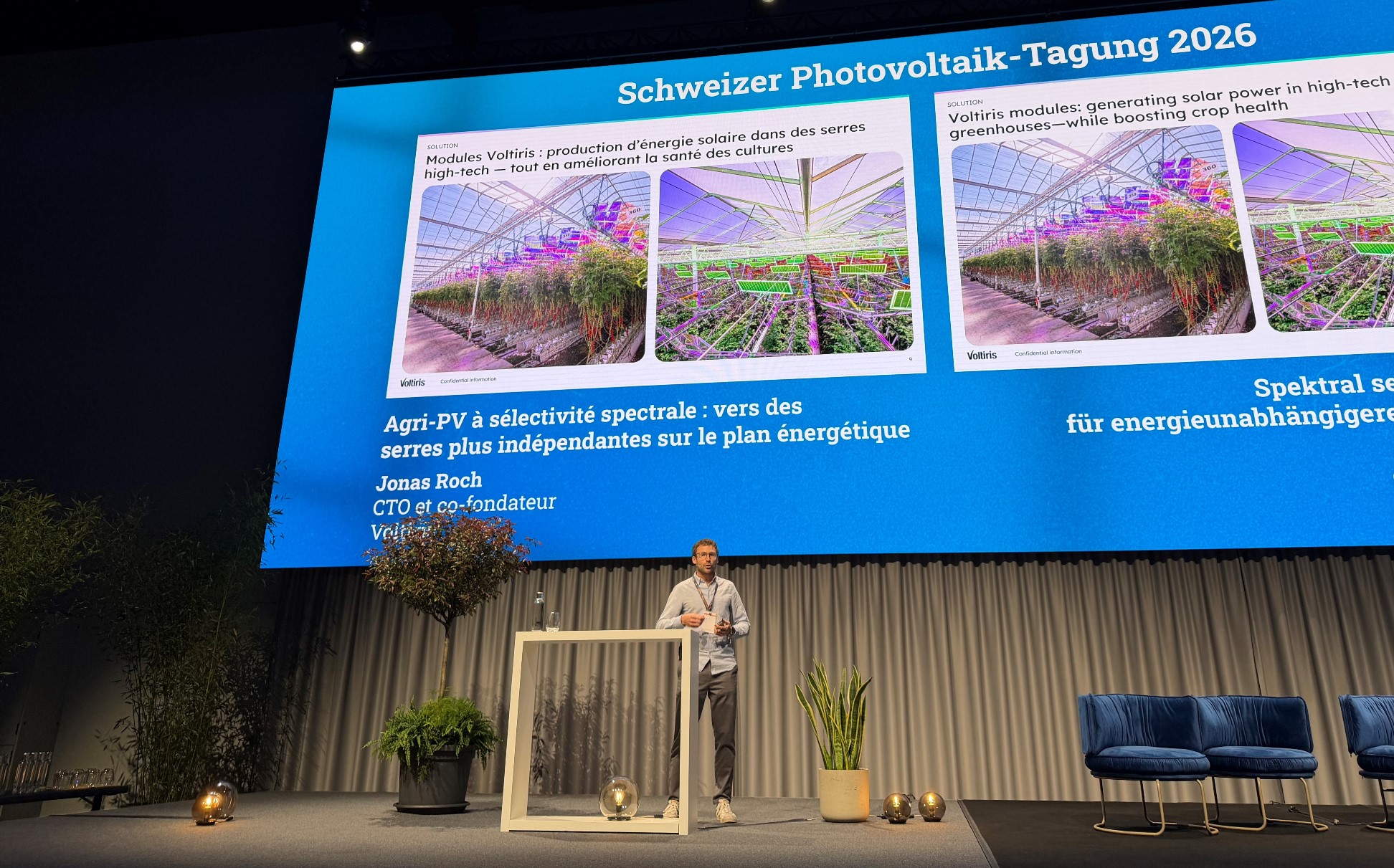 Jonas Roch, Voltiris, a expliqué comment l’agrivoltaïque pouvait même augmenter le rendement agricole. | Figure: Cynthia Hengsberger