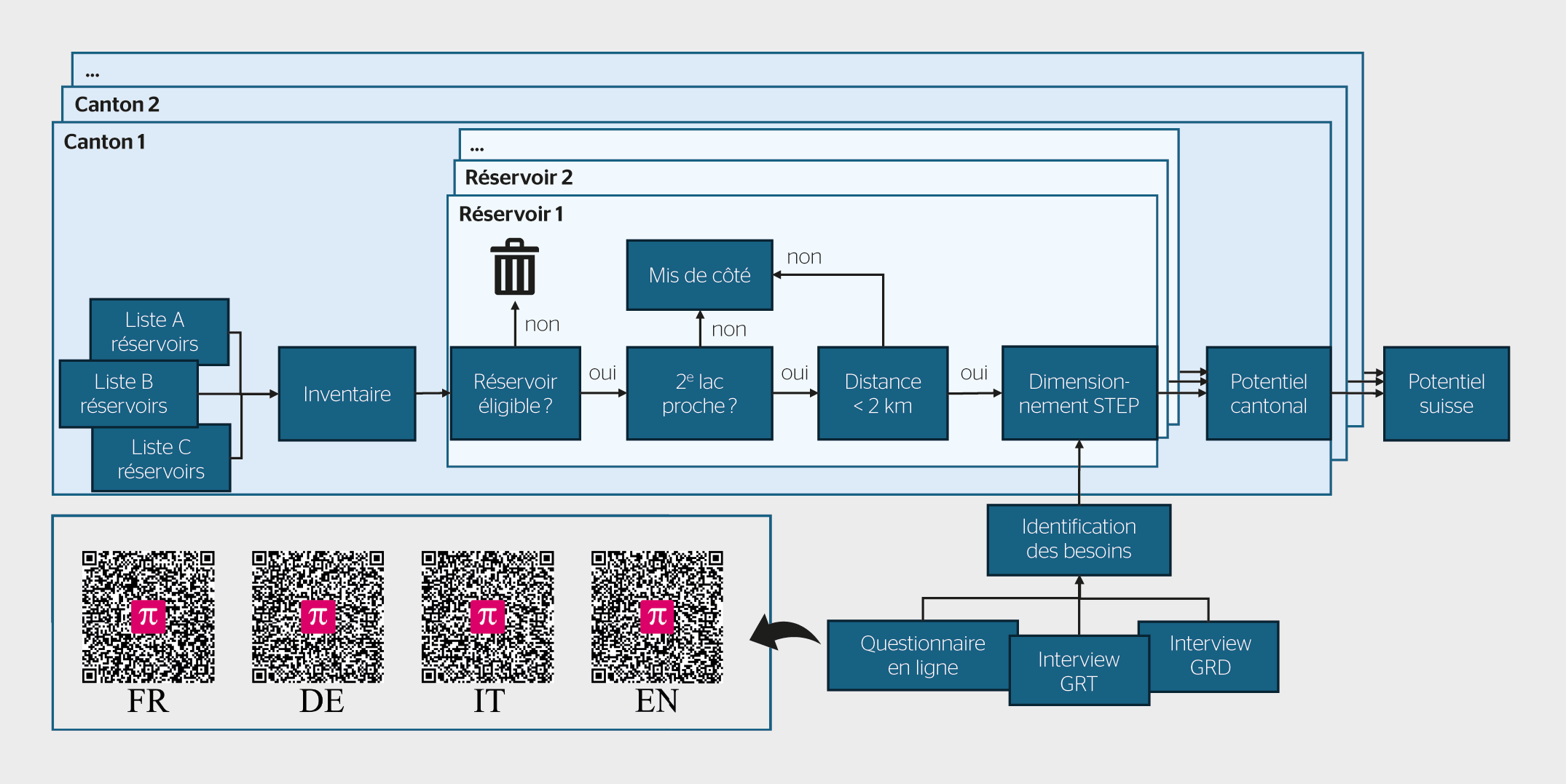 Dans un premier temps, un recensement des réservoirs existants est effectué dans les cantons romands, puis une extrapolation sera réalisée à l’échelle de la Suisse pour estimer le potentiel national «caché». La nouvelle dynamique des prix de l’électricité est prise en considération afin de fournir un résultat le plus fidèle possible à la réalité, et la pertinence du développement des sites rentables sera évaluée en définissant des critères de sélection des sites et en dimensionnant les centrales en fonction des besoins futurs.