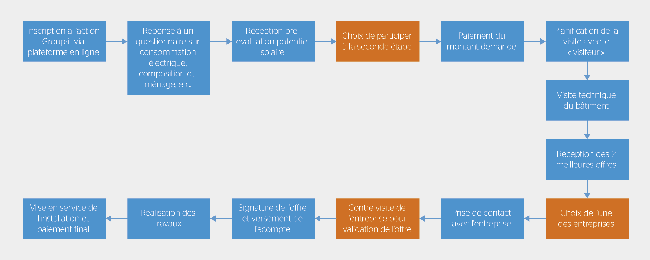 Le processus de la figure 3 (Customer Journey Map) met en exergue les principales tâches du client au sein du processus Group-it, ainsi que celles qui le concernent directement (visite, contre-visite et réalisation des travaux). Les cases orange constituent des étapes charnières auxquelles le processus pourrait prendre fin sur décision du client.
