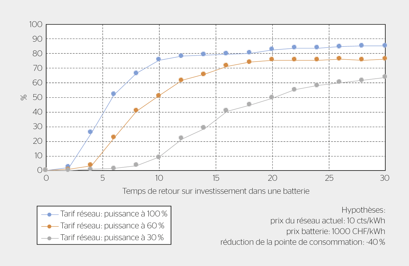 Les tarifs d’utilisation du réseau doivent donner des signaux clairs afin de lisser au maximum le soutirage sur le réseau; une attention particulière doit être portée sur les effets de l’arrivée des installations de stockage d’énergie et la baisse prévisible de leurs coûts. En effet les batteries de stockage permettent facilement de réduire les pointes de consommation sur 15 minutes en fournissant de l’énergie; les 15 minutes suivantes sont consacrées à la recharge de cette même batterie pour qu’elle soit prête à réagir à la pointe suivante. Ce comportement, incité par exemple par un tarif puissance, ne présente aucun bénéfice pour le réseau parce que, comme nous l’avons explicité précédemment, la pointe individuelle ne correspond que très rarement à la pointe réseau, et les pointes dans le réseau s’étendent sur des durées plus importantes que les pointes individuelles. Un argument souvent utilisé pour justifier la facturation de la puissance est la «désolidarisation» des autoproducteurs/autoconsommateurs qui payent moins pour le réseau si celui-ci est facturé par un tarif de travail. En appliquant le même argument aux propriétaires de batteries, un tarif de puissance induirait une désolidarisation de leur part vis-à-vis des consommateurs sans installation de stockage d’énergie. Le graphique de la figure 3 montre une dynamique forte en faveur de l’installation de batteries en cas de mise en place (extrême) d’un tarif où seule la puissance est facturée. En effet, 75% des 143 clients analysés verraient dans un tel cas un retour sur investissement d’une batterie de stockage inférieur à 10 ans.