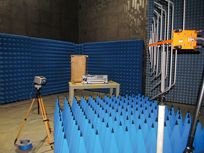 Les tests d’émission et d’immunité rayonnées sont réalisés soit sur un site en champ libre en extérieur (OATS), soit en chambre semi- (SAC, figure 3) ou complètement (FAR) anéchoïque. Celles-ci sont des cages de Faraday aux parois recouvertes de mousses absorbantes combinées avec des ferrites qui absorbent les ondes électromagnétiques. Ces cages permettent d’être isolé des perturbations extérieures et donc de se concentrer sur les seules émissions rayonnées par l’appareil en test (EUT, equipment under test). On y réalise habituellement des mesures à 3 ou 10 m de distance entre l’antenne et l’EUT.