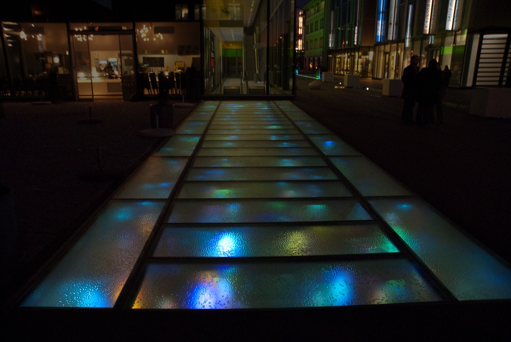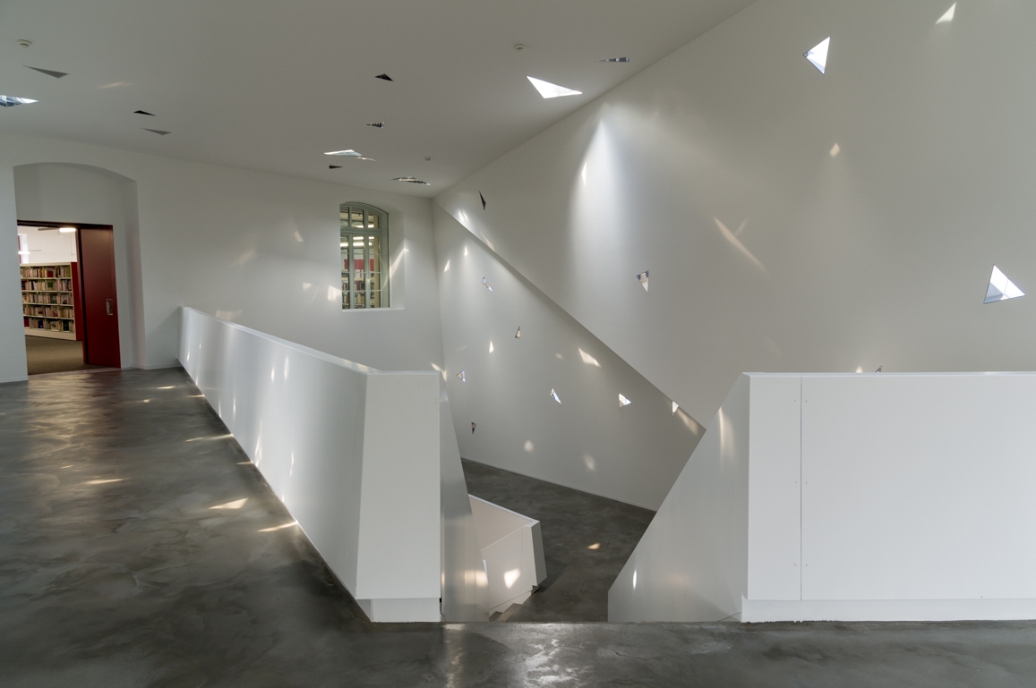 Le passage reliant les deux bâtiments de la médiathèque de Sion est un fascinant exemple de la combinaison optimale de ces deux sources de lumière. La lumière naturelle pénètre dans le bâtiment à travers des ouvertures triangulaires tapissées de miroirs. Ces derniers ont la double fonction, d’une part, de créer un kaléidoscope pour l’observateur qui regarde à l’extérieur et, d’autre part, de projeter leurs multiples réflexions sur les murs intérieurs du bâtiment. Il en résulte un éclairage vivant, dont la position et l’intensité varie en fonction de l’heure et de la couleur du ciel. Pour assurer un apport de lumière suffisant par temps maussade, l’artiste l’a complété par un éclairage LED intégré également de forme triangulaire. Intitulée «Éclat minéral», cette œuvre rend, avec ses réflexions mouvantes telles que celles d’un cristal, un vibrant hommage à la beauté du Valais.