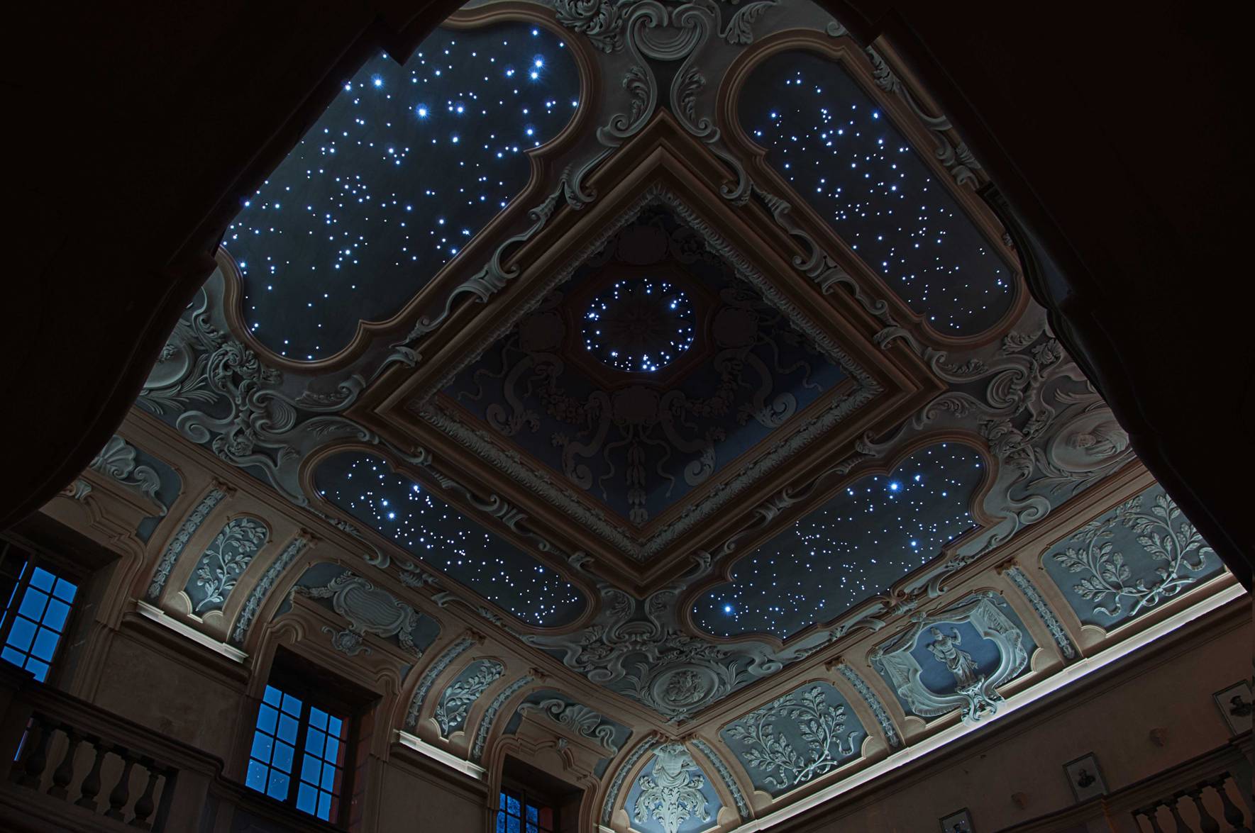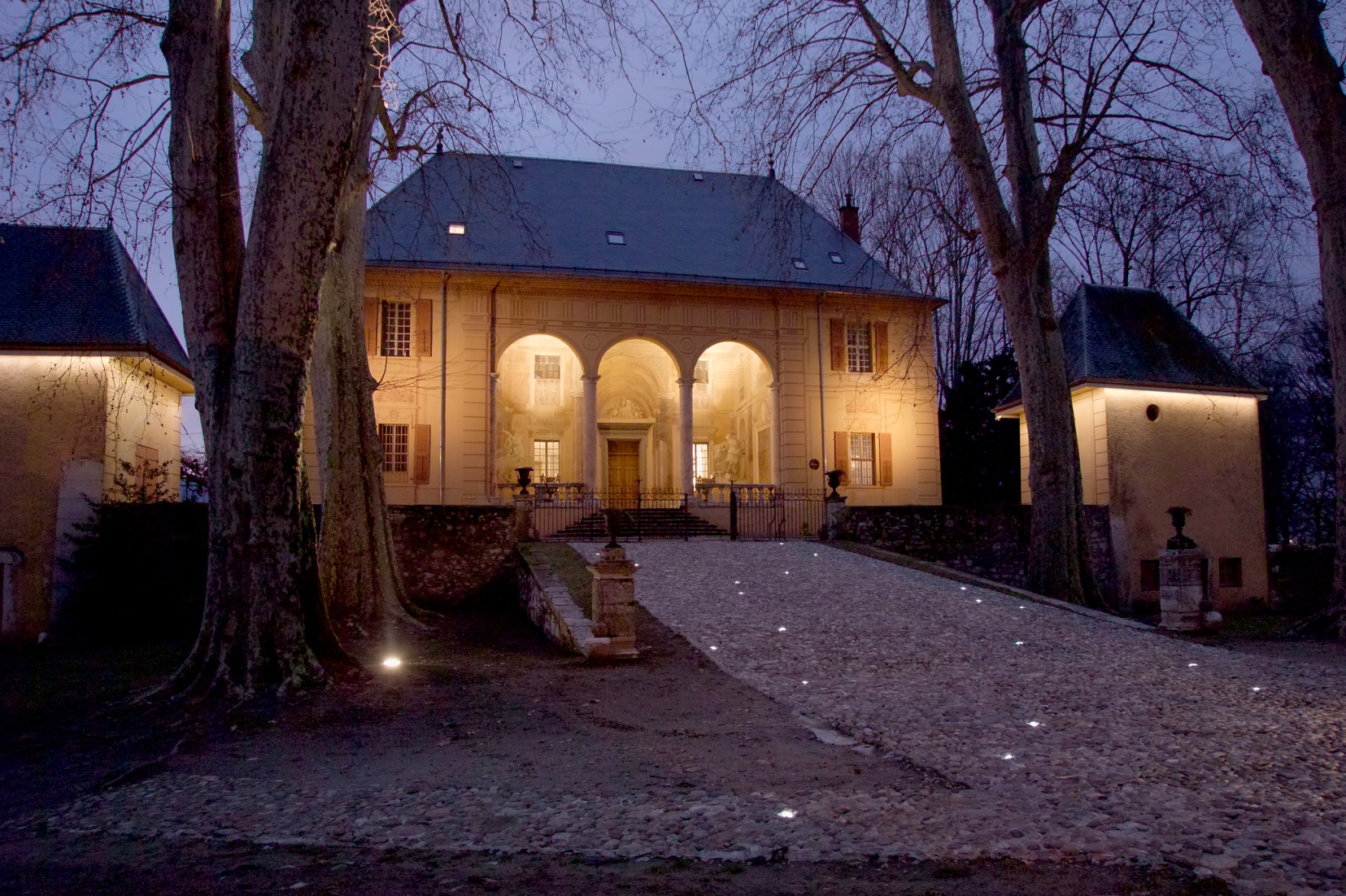 Celui du Château de Caramagne lui a valu le Prix rhônalpin du patrimoine en 2010. En arrivant au portail de ce domaine situé sur la commune de Chambéry, le visiteur peut se laisser guider par la «chute d’étoiles», des pavés lumineux ponctuant l’allée, qui le mènera jusqu’au bâtiment principal. Toute la difficulté du projet a résidé dans la mise en valeur de la superbe façade peinte du château alors que rien ne permettait d’y cacher des luminaires. L’artiste s’est donc ingénieusement servi des puits de lumière virtuels peints au plafond de la loggia pour y installer ses sources lumineuses et donner un effet plus naturel à l’éclairage. Qui pourrait dire au premier coup d’œil que le fronton de la porte n’est qu’un trompe-l’œil? Le projet d’éclairage comprenait également les dépendances et a été complété à l’intérieur du bâtiment par la réalisation d’un ciel étoilé doté d’un éclairage artificiel, une fois n’est pas coutume, sur la voûte de la pièce principale.