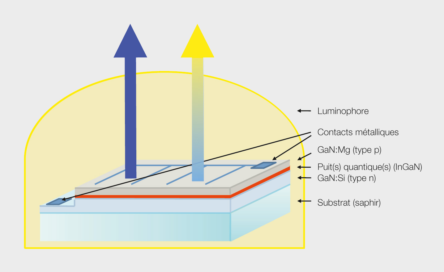 Les LED blanches sont généralement composées de LED bleues recouvertes d’un luminophore jaune. La première étape de leur fabrication (figure 1) consiste à faire croître une couche de quelques micromètres de semi-conducteur de type n (donneur d’électrons), typiquement du nitrure de gallium dopé avec des atomes de silicium (GaN:Si), sur un substrat transparent d’une dizaine de centimètres de diamètre, presque exclusivement du saphir. Vient ensuite la réalisation de la zone active composée d’une ou plusieurs couches ultraminces (des puits quantiques de quelques nanomètres d’épaisseur, typiquement en InGaN) au sein desquelles aura lieu l’électroluminescence. Cette étape est suivie de la croissance d’une seconde couche de nitrure de gallium de 200 nm d’épaisseur, dopé cette fois avec du magnésium (GaN:Mg) pour obtenir un semi-conducteur de type p, donneur de trous, aboutissant ainsi à la création de la jonction p-n. Des contacts métalliques sont alors réalisés, le semi-conducteur de type n étant contacté grâce à un trou gravé sur la face avant de manière à atteindre la couche de GaN:Si. La LED bleue ainsi obtenue est finalement recouverte d’un luminophore qui, une fois excité par une partie du rayonnement bleu de la LED, émettra une lumière jaune. [1] La combinaison de ces rayonnements bleu et jaune permet d’obtenir une lumière blanche de forte intensité.