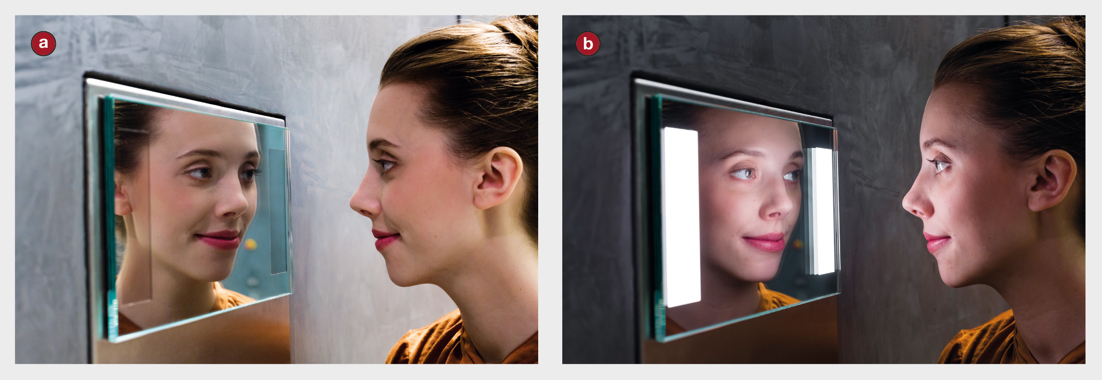 Les OLED permettent de réaliser des sources de lumière d’intensité variable, non éblouissantes, extrêmement fines, efficientes, émettant une belle lumière diffuse et douce, uniforme dans toutes les directions (émission lambertienne) et ne projetant que peu d’ombre ou une ombre floue (figure 3). Ces caractéristiques réduisent notablement la fatigue oculaire, offrant ainsi un véritable confort aux personnes exposées plusieurs heures par jour à la lumière artificielle. Il s’agit d’ailleurs, à l’exception des ampoules à incandescence, de la source artificielle dont le spectre est le plus proche de celui de la lumière naturelle. Les spectres d’émission des molécules organiques sont en effet plutôt larges et les différents semi-conducteurs organiques utilisés pour obtenir de la lumière blanche émettent des photons de différentes énergies. Finalement, elles n’émettent pas d’UV et, contrairement à certaines LED, elles n’affichent pas un pic d’intensité dans le bleu.