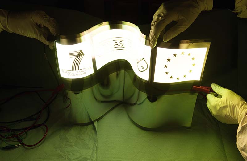 Les OLED flexibles imprimées constituent, quant à elles, une option intéressante pour une production à moindre coût. Des rouleaux de plusieurs centaines de mètres de substrat en PET incluant barrière et électrode ont déjà été réalisés par un procédé roll-to-roll peu coûteux au sein d’un projet de recherche européen. Ce procédé a également permis la réalisation de premières OLED imprimées à la manière des journaux. Les couches barrières et trois des quatre types d’électrodes transparentes et flexibles développées dans ce projet sont depuis commercialisées. Un premier pas vers la production en masse d’OLED flexibles, sans indium et peu onéreuses ?