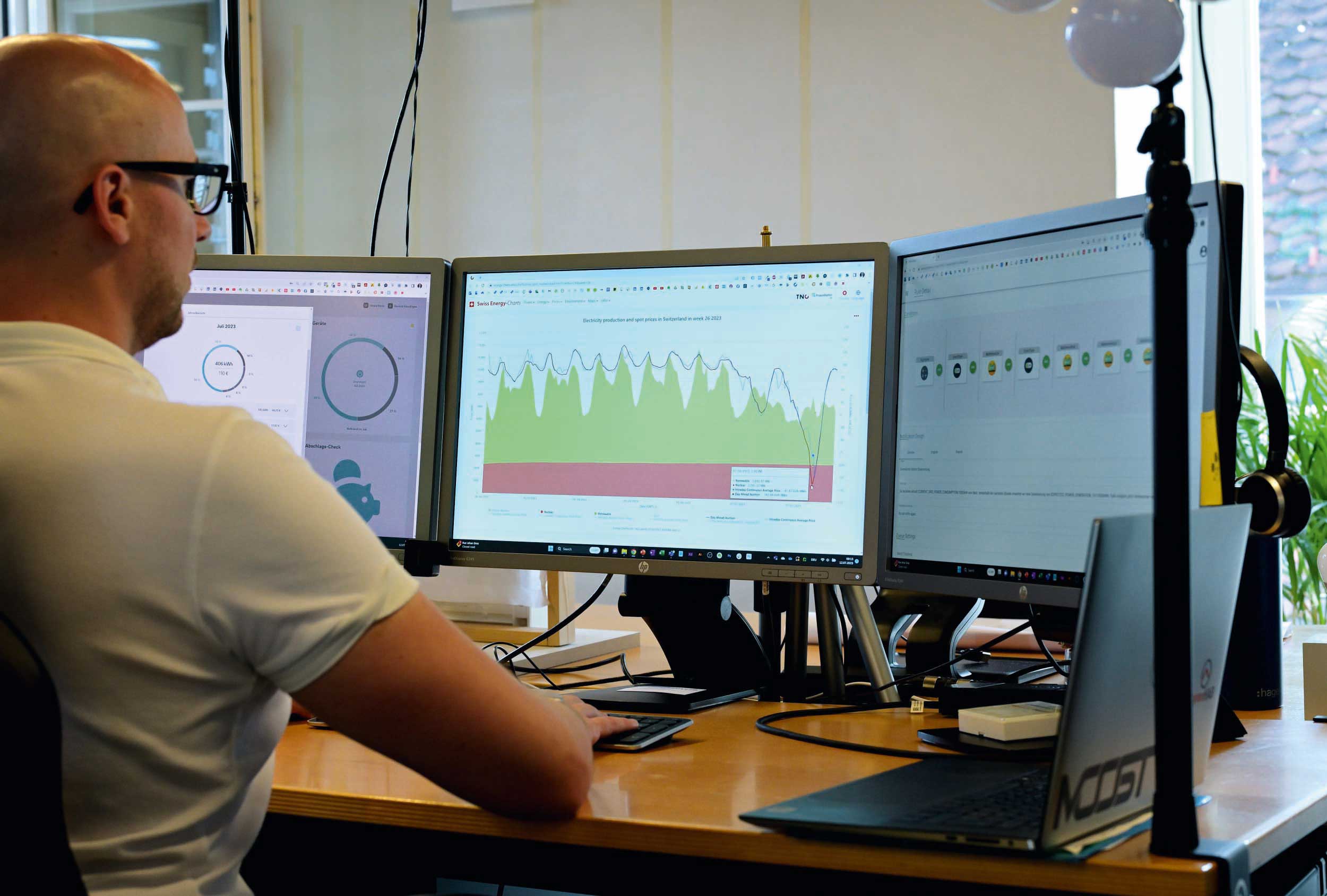 Souvent, l’acquisition d’un système de gestion de l’énergie complet ne se fait pas dès le départ. Joel Samsinger décrit le déroulement ainsi: «C’est plutôt un processus naturel: les gens achètent par exemple une voiture électrique et une station de recharge, et ils se rendent compte ensuite qu’ils consomment deux fois plus d’électricité qu’auparavant. Ils décident alors de se munir de leur propre installation photovoltaïque. Lors de la réalisation de celle-ci, l’installateur constate qu’il y a déjà une pompe à chaleur Smartgridready et l’intègre directement au système. Et voilà déjà un système de gestion de l’énergie assez performant, qui permet de faire beaucoup de choses, y compris des économies d’énergie.»