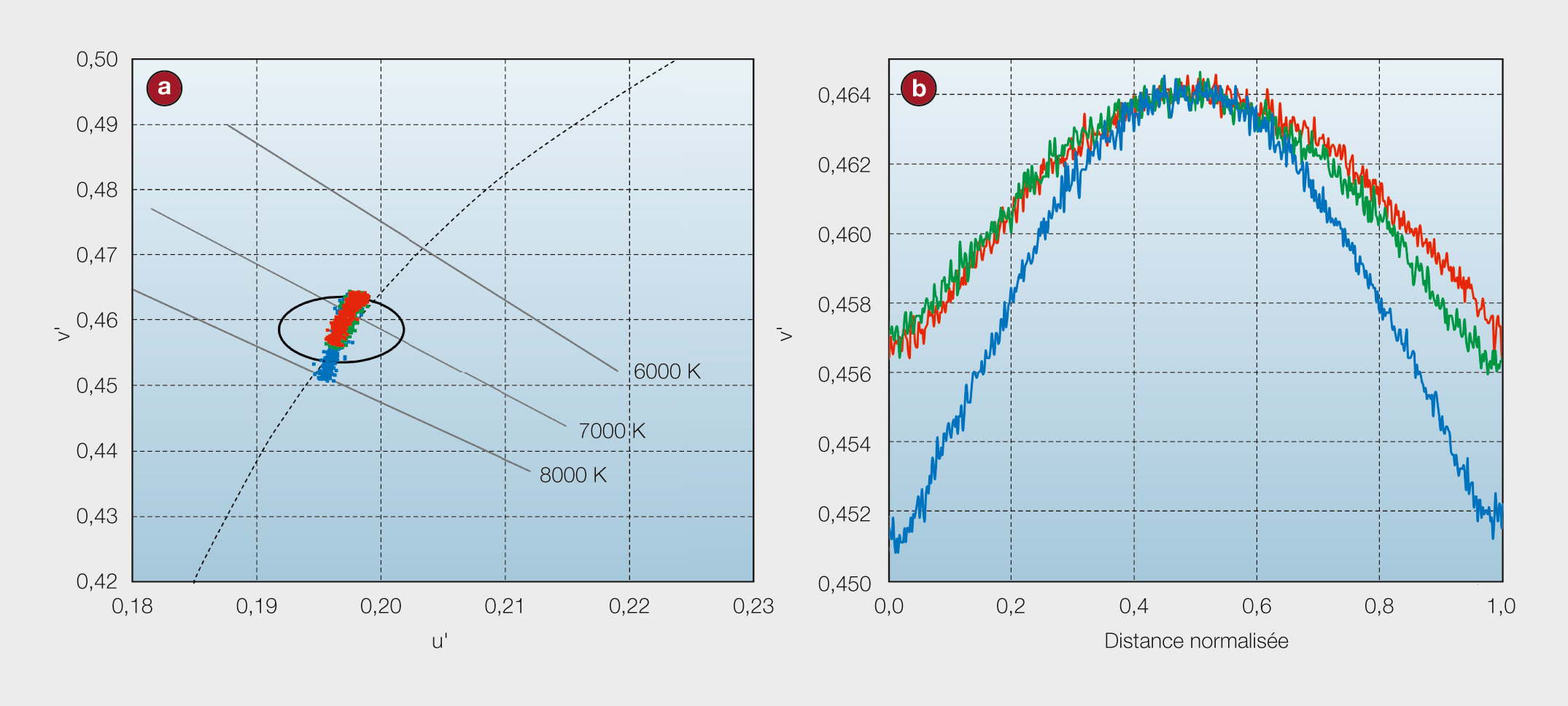 Finalement, le Plexiglas, comme la plupart des plastiques, absorbe plus de lumière de courtes longueurs d’onde que de longues (c’est-à-dire plus dans le bleu que dans le rouge). Par conséquent, des différences de couleurs peuvent apparaître à travers la surface émettrice des modules [2]. Comme montré dans la figure 4, les coordonnées de couleur CIE u’v’ de la lumière diffusée par différents points de la surface émettrice du module testé changent considérablement le long des lignes bissectrices verticale (rouge), horizontale (vert) et diagonale (bleu).