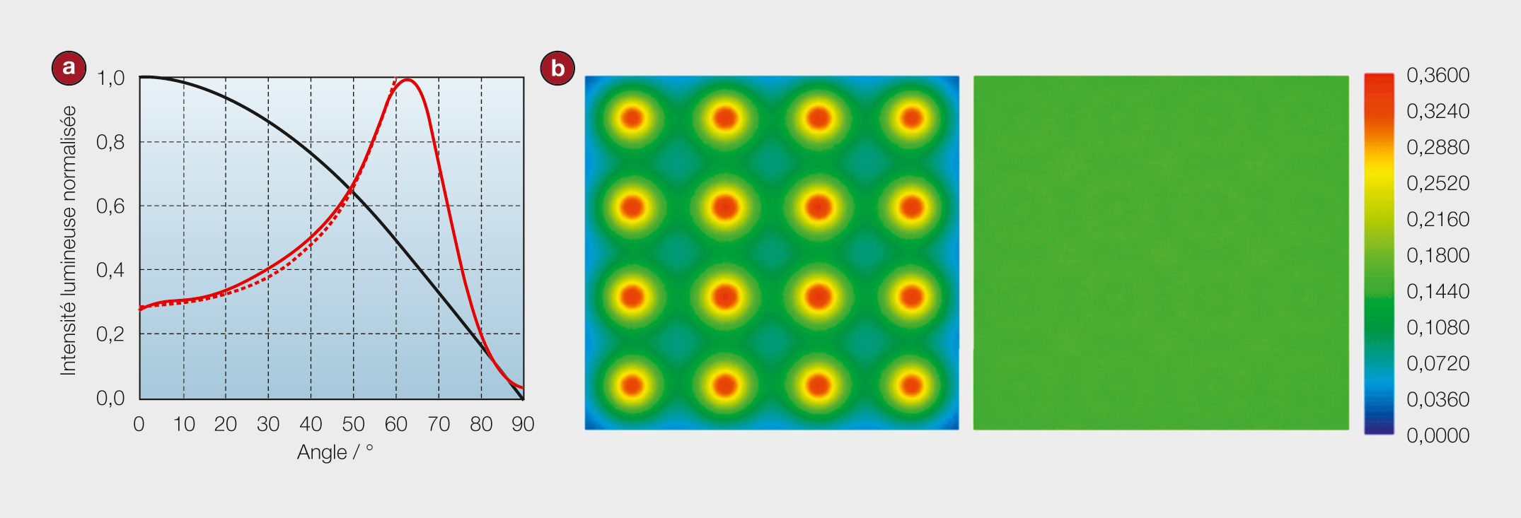 Façonner le faisceau de lumière émis par les LED et passer d’un profil lambertien à un profil appelé communément « en aile de chauve-souris » (« batwing », fonction d’émission en cosinus cube) est une option efficace pour obtenir une illumination uniforme sur une surface plane (figure 5). Entre autres, Samsung [27], Osram [28] et LG [29] utilisent actuellement cette approche. Cependant, toutes ces solutions impliquent la fixation d’une lentille relativement encombrante sur chaque LED. Si l’efficacité est plutôt élevée (autour de 85%) [2], le coût des lentilles, puis de la fabrication n’est donc vraisemblablement pas négligeable.