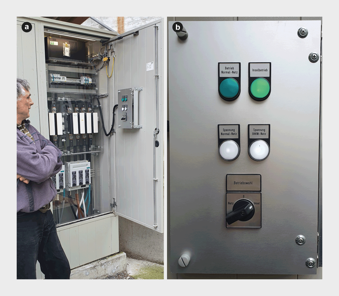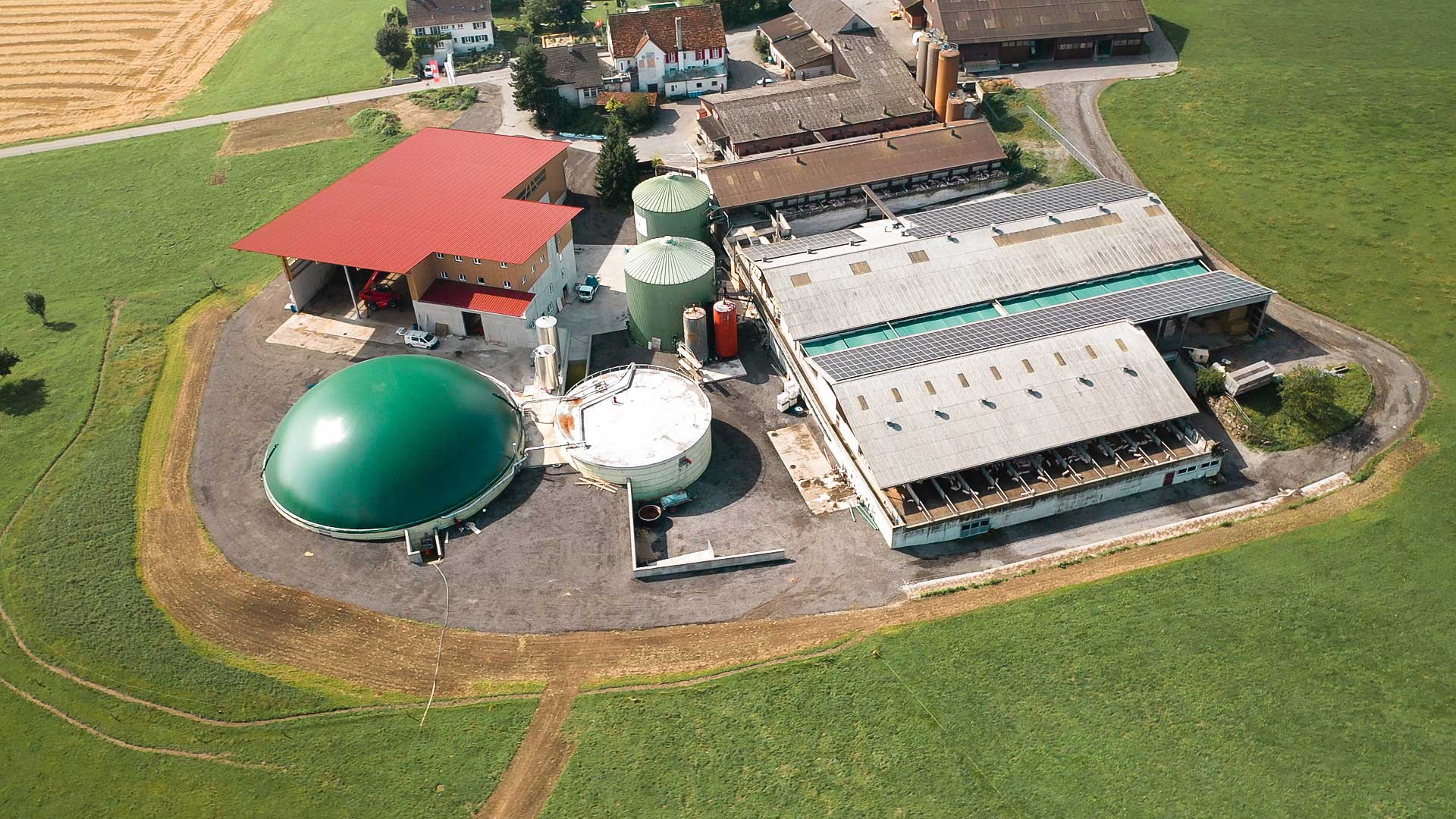 Des essais en conditions réelles de l’alimentation électrique de secours ont été réalisés à Amlikon-Bissegg/TG, sur le site de la fromagerie et exploitation agricole «Holzhof» (figure de titre) de l’agriculteur et partenaire du projet Otto Wartmann (figure 1). Deux installations photovoltaïques, d’une puissance totale de 360 kW, y produisent chaque année 330 MWh d’électricité. L’une d’elles se trouve sur le toit de la porcherie, et l’autre a été installée sur le toit rouge après que la photographie utilisée comme figure de titre ait été prise. À cela s’ajoutent une installation de biogaz et trois centrales de cogénération d’une puissance totale de 750 kW qui, en plus de la chaleur, fournissent au total 5 GWh d’électricité par an (figure 2). Dans le cadre d’un premier test d’exploitation en îlot sur le terrain, l’une des trois centrales de cogénération, d’une puissance de 320 kW, a été utilisée pour produire de l’électricité de secours. Bien qu’il y ait déjà suffisamment d’électricité disponible pour le fonctionnement d’urgence, l’installation photovoltaïque située sur le toit rouge, d’une puissance de 120 kW, a été intégrée dans l’alimentation de secours en plus de la centrale de cogénération lors d’un deuxième test. L’équipe du projet voulait ainsi clarifier si, et dans quelles conditions, une combinaison de plusieurs centrales électriques décentralisées était possible.