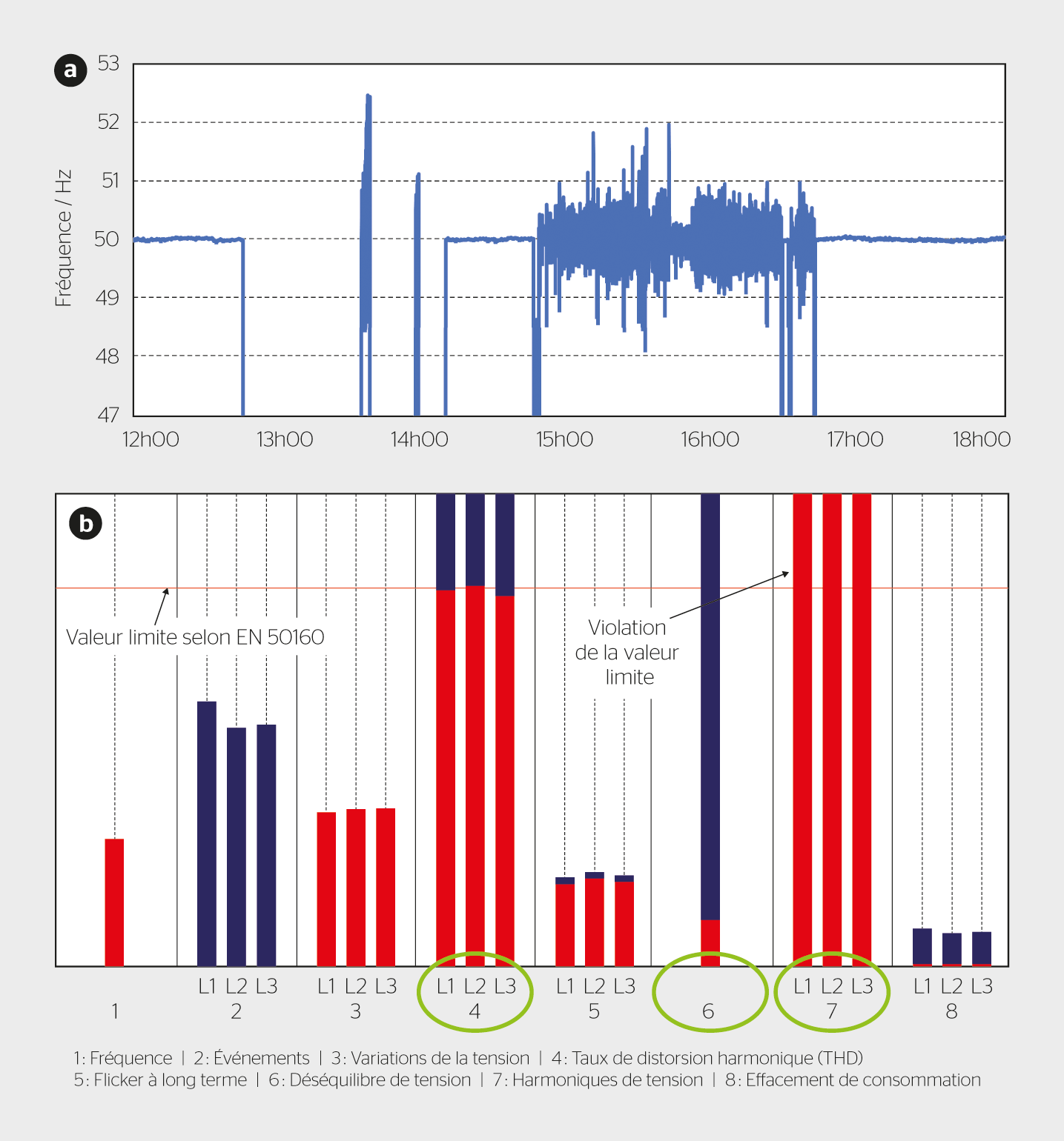 Une alimentation électrique de secours capable de fournir de l’électricité pendant plusieurs jours ou semaines est particulièrement exigeante. Dans de tels cas, l’approvisionnement en substrats pour l’installation de biogaz doit être assuré. De plus, la qualité du réseau doit répondre à des exigences élevées. La norme européenne EN 50160 formule en effet différentes exigences relatives à la qualité de l’alimentation électrique. Le réseau en îlot mis en place à titre d’essai à Amlikon-Bissegg n’a pas été en mesure de respecter à tout moment les valeurs limites fixées dans la norme (figure 3). Les écarts mesurés permettent le fonctionnement du réseau de secours, mais des adaptations de la protection RI externe de l’installation photovoltaïque sont nécessaires afin de permettre l’injection dans le réseau. Certes, les exigences de normes telles que la norme européenne EN 50160 ne sont pas directement applicables à une exploitation de secours découplée du réseau, mais elles constituent une bonne base pour évaluer la qualité nécessaire du réseau en ce qui concerne le maintien de la tension et de la fréquence. Si un fonctionnement d’urgence s’étend sur une longue durée, des dégradations de la qualité du réseau peuvent endommager les consommateurs électriques, par exemple en raison de contraintes thermiques accrues en cas de décalage des charges. L’intégration des énergies renouvelables dans l’alimentation de secours nécessite donc une planification minutieuse du réseau de secours et des composants impliqués.