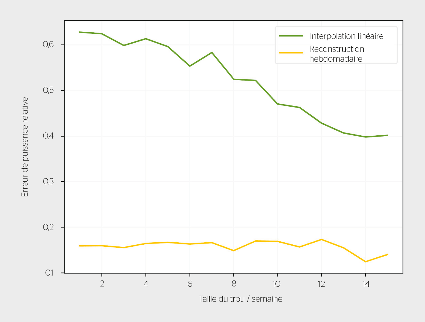 Évaluer le procédé mis en place requiert de pouvoir comparer les valeurs reconstruites aux valeurs réelles, qui sont inconnues dans le cas des plages de données manquantes. Des trous artificiels de différentes durées (variant de 1 à 15 semaines) ont donc été créés parmi les données réelles dans le but de reconstruire ces valeurs manquantes et de pouvoir les comparer aux vraies valeurs (figure 2). Différents indicateurs sont couramment utilisés dans la littérature pour évaluer la prédiction de séries temporelles [4], et il faut tenir compte ici du fait que les courbes de charge peuvent contenir des valeurs d’ordres de grandeur très différents en fonction du consommateur (foyer privé ou grande entreprise). La puissance électrique totale reconstruite sur une plage de données manquantes a ensuite été comparée à la puissance électrique réelle en calculant l’«erreur de puissance relative». Cette dernière permet de mesurer la performance du procédé de reconstruction à l’échelle de la longueur de la plage de données manquantes, mais ne caractérise pas la reconstruction à la granularité de la série temporelle.