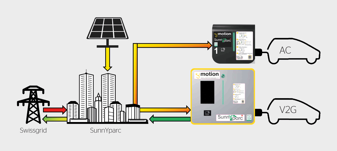 Soutenu par l’Office fédéral de l’énergie et par le canton de Vaud, SunnYparc est un projet pilote impliquant cinq entreprises suisses, qui vise à explorer les synergies entre la production locale d’énergie renouvelable et la mobilité électrique. Celui-ci prévoit de mettre en place 250 bornes de recharge pour véhicules électriques d’ici fin 2025 sur le site d’Y-Parc, à Yverdon-les-Bains, et de les relier aux consommateurs industriels locaux par le biais d’un microréseau intelligent intégrant une importante production photovoltaïque (PV). L’objectif de ce projet consiste à démontrer que la recharge intelligente de ces véhicules – en particulier en exploitant la technologie «Vehicle-to-Grid (V2G)» et en privilégiant l’énergie photovoltaïque produite localement – a le potentiel de soulager la pression exercée sur le réseau électrique suisse.