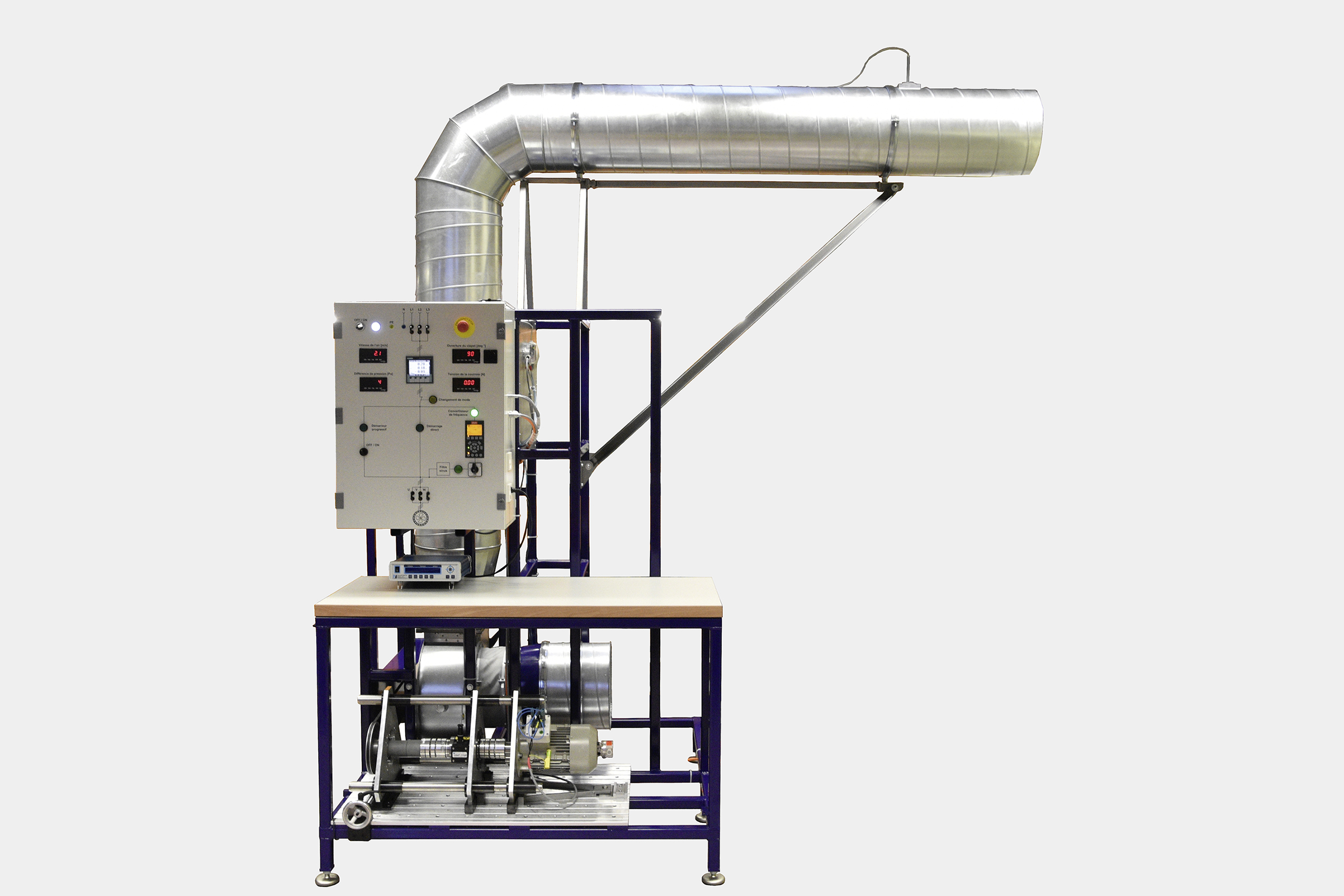 Afin d’effectuer différentes analyses énergétiques, un banc d’essai (figure 1) a été développé à la Haute école d’ingénierie et de gestion du canton de Vaud (HEIG-VD). Il est composé d’un système de ventilation comportant un moteur qui entraîne le ventilateur par l’intermédiaire d’une courroie. Le moteur peut être soit branché directement sur le réseau électrique – dans ce cas, le débit d’air est contrôlé avec un clapet motorisé –, soit alimenté par l’intermédiaire d’un démarreur progressif ou par un convertisseur de fréquence installé sur le banc. Le convertisseur de fréquence dispose d’un filtre qui peut être branché ou déconnecté aisément.