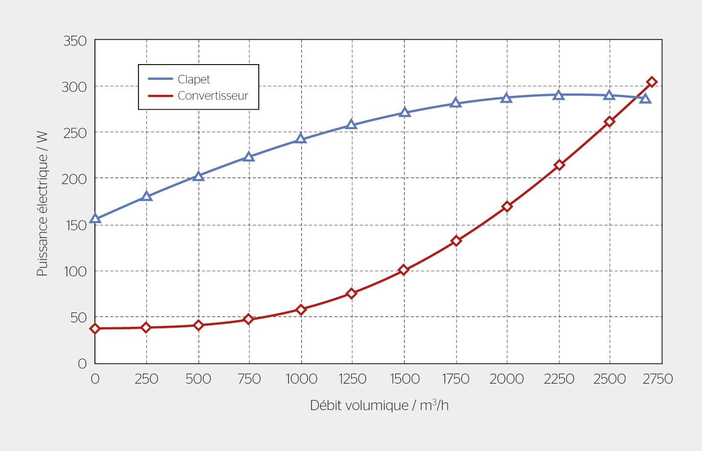La figure 2 montre la puissance électrique absorbée par un ventilateur pour un réglage du débit avec clapet et avec convertisseur de fréquence. Le convertisseur de fréquence permet de régler précisément la vitesse du moteur pour contrôler le débit d’air et ainsi de réduire fortement la consommation d’énergie par rapport au réglage par étranglement à l’aide du clapet, et ce, particulièrement dans le cas des faibles débits. En effet, pour obtenir un débit de 1250 m3/h, il suffit avec le réglage de vitesse de faire tourner le moteur à 715 tr/min, soit environ deux fois moins rapidement que dans le cas du contrôle au moyen du clapet (1459 tr/min). Pour ce débit, la puissance électrique absorbée est divisée par un facteur 3,4 (260 W pour la réduction du débit au moyen du clapet contre 76 W en utilisant le convertisseur de fréquence).