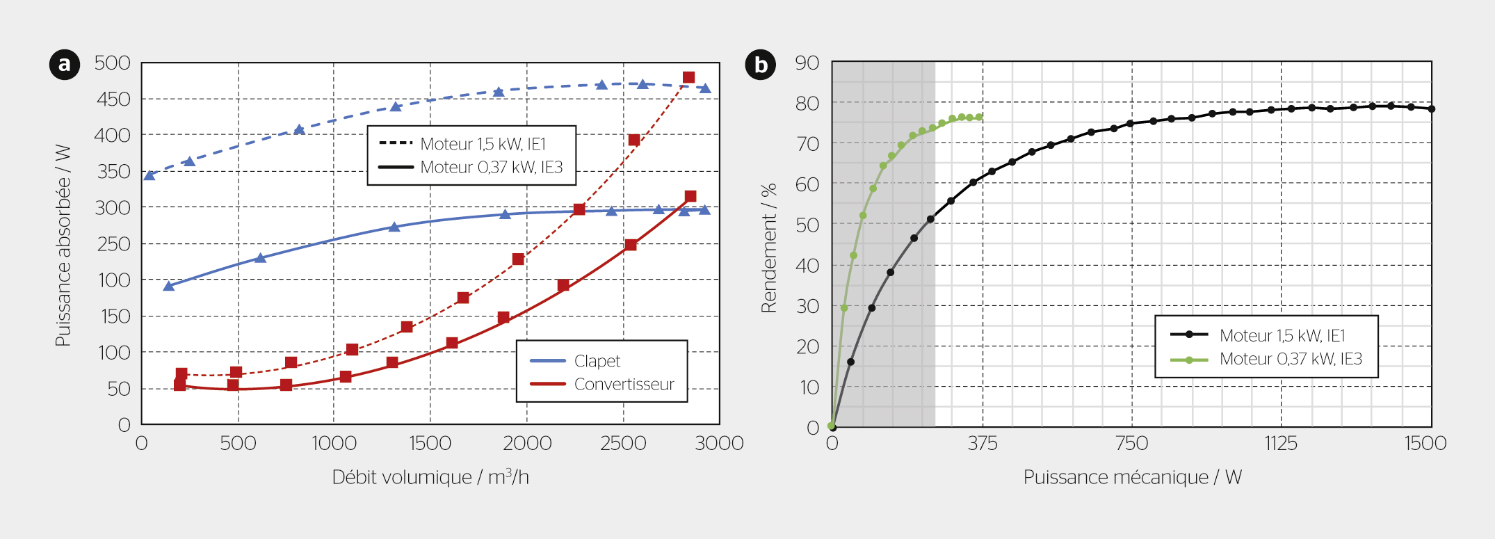 Grâce à un dispositif d’alignement approprié, le banc d’essai permet également de changer facilement le moteur d’entraînement. Il est alors possible de comparer plusieurs types de moteurs et d’analyser l’effet d’un surdimensionnement. La figure 3a montre la puissance électrique absorbée en fonction du débit d’air avec un moteur asynchrone IE3 d’une puissance nominale de 0,37 kW, ainsi qu’avec un ancien moteur IE1 de 1,5 kW largement surdimensionné pour l’application.