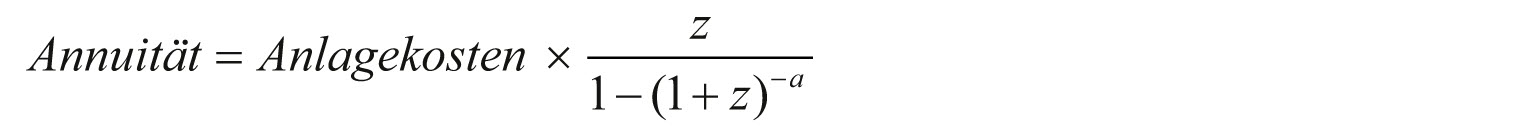 Beispiel: (z = 1,75%, a = 25 Jahre, Anlagekosten nach Abzug der einmaligen Investitionsvergütung 38’000 CHF); jährliche Kapitalkosten = 1890 CHF.