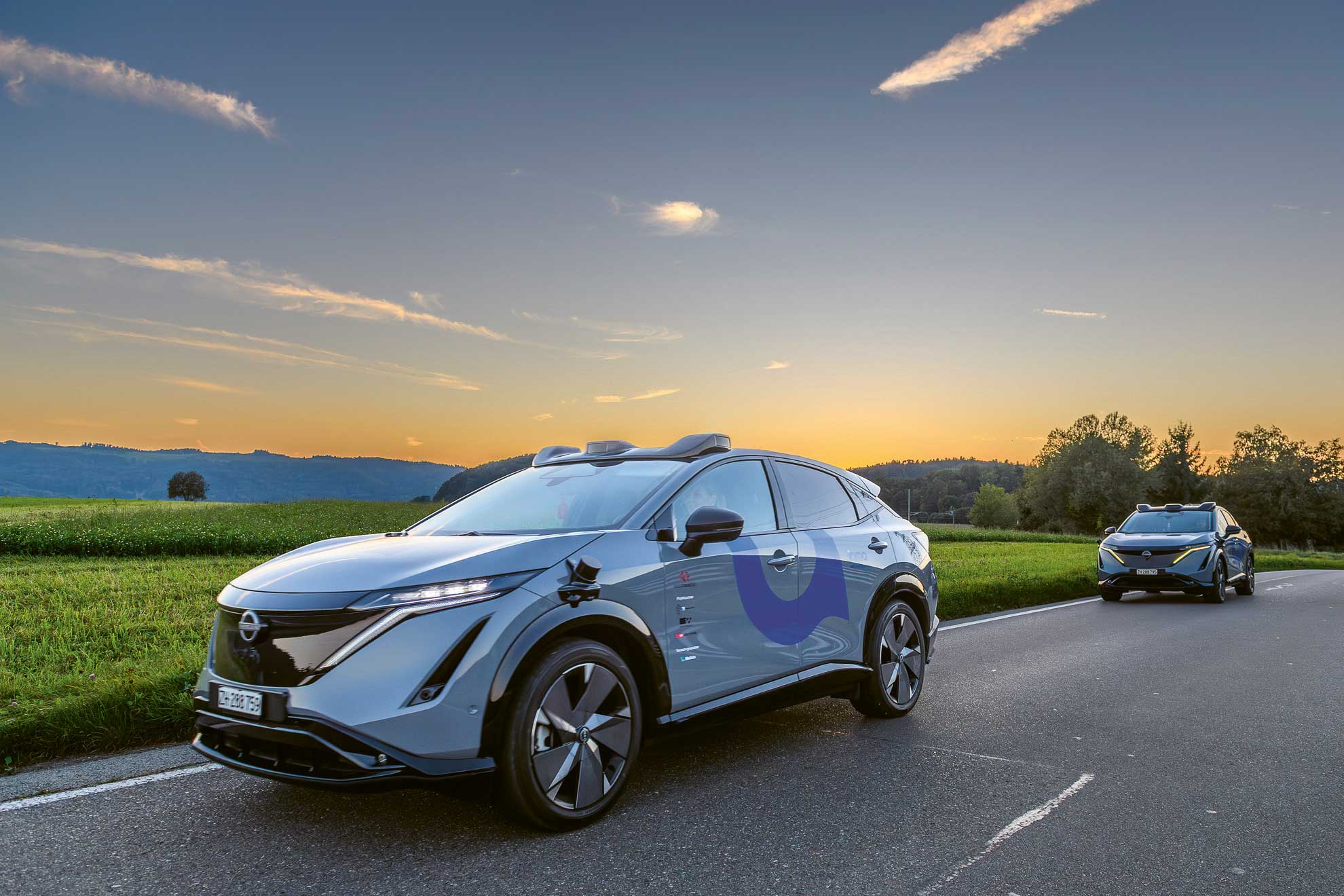 Nach der Medienkonferenz gehen die Gäste nach draussen, um automatisiertes Fahren live zu erleben. Als einige der ersten Fahrgäste können sie mit den Pilotfahrzeugen des Typs Nissan Ariya eine Fahrt unternehmen. Wer eine futuristische Technologie erwartet, wird hier eines Besseren belehrt: Abgesehen von den Sensoren auf dem Dach und an den Seiten wirken die Fahrzeuge gewöhnlich und fügen sich unauffällig in den Strassenverkehr ein.