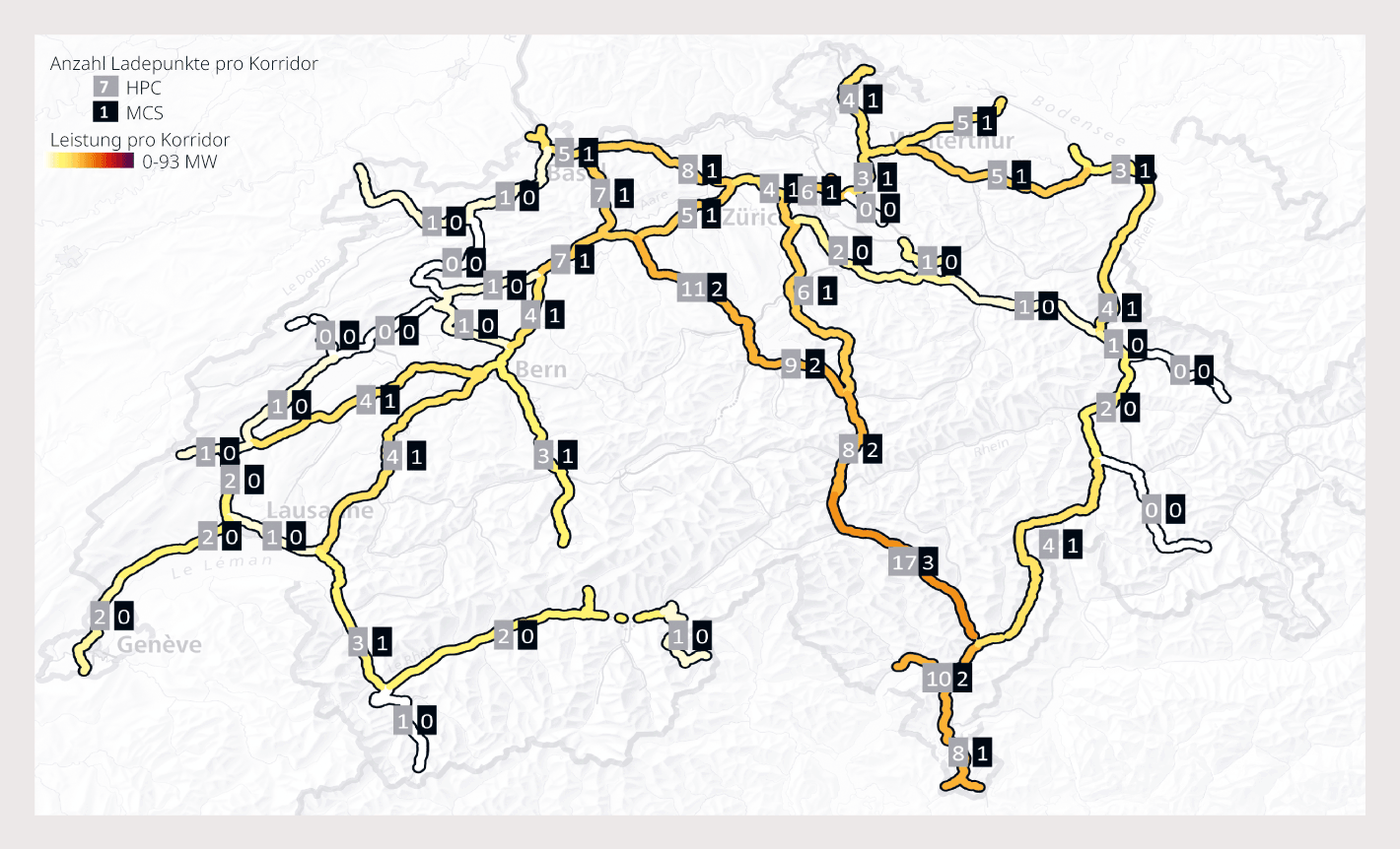 Zu einem ähnlichen Ergebnis kommt die Studie Swiss e-Cargo, die das Beratungsbüro Infras mit drei Projektpartnern realisiert hat [2]. Im Ladeszenario «Basis» sind demnach bis 2030 insgesamt 216 öffentliche Ladepunkte entlang der Nationalstrassen nötig, 84% davon als Hochleistungsladestellen (HPC/400 kW Leistung) und 16% als Megawatt-Ladestellen (MCS/1 MW Leistung). Die total installierte Ladeleistung soll 107 MW betragen. Die Ergebnisse beider Studien dienen dem Bundesamt für Strassen Astra zur Planung der Schnellladeinfrastruktur entlang der Nationalstrassen.