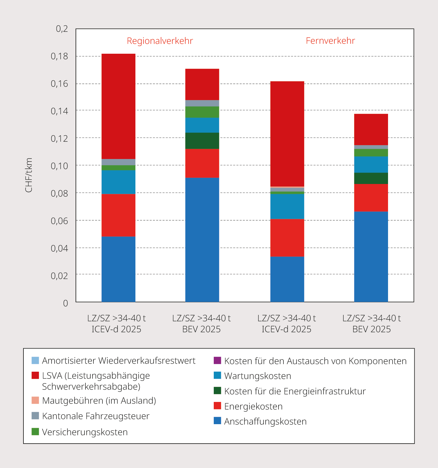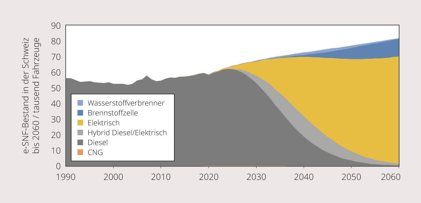 Gemäss den Szenarien von Swiss eCargo werden bei günstigen Rahmenbedingungen im Jahr 2040 80% der neu zugelassenen Nutzfahrzeuge elektrisch fahren und rund die Hälfte des Bestands elektrisch sein. Andere fossilfreie Antriebstechnologien wie Wasserstoff-Antriebe werden eine Nischenrolle spielen. Die Gesamtbetriebskosten (TCO) von Elektro-Lkw liegen teilweise bereits unter denen von Diesel-Lkw und dürften weiter sinken. Planungssicherheit und öffentliche Subventionen sind jedoch nötig, um die Ladeinfrastruktur in Depots, insbesondere von KMUs, zu fördern und einem Rückgang des Marktwachstums aufgrund der derzeit diskutierten Einführung der LSVA und einer Steuer auf Elektrofahrzeuge als Ersatz für die Mineralölsteuer entgegenzuwirken.