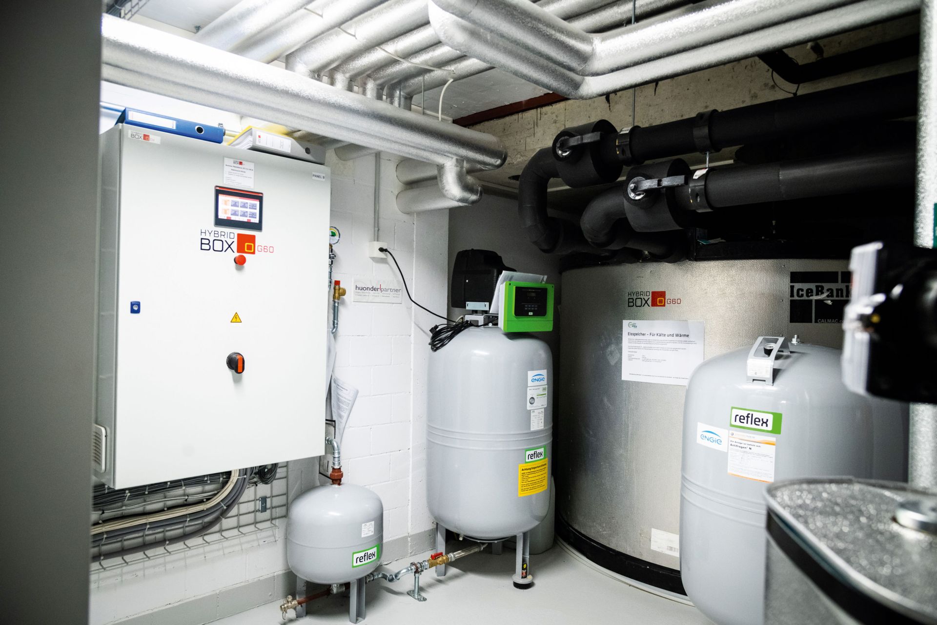 Das Herzstück der Siedlung ist eine Energiesteuerung und Aufbereitungsanlage, Hybridbox genannt. Diese ermöglicht es, das Konzept an verschiedenen Orten zu realisieren. Sie besteht aus einer Wärmepumpe, einer gasbetriebenen Wärme-Kraft-Kopplungs-Anlage und der «Intelligenz», die die PV-Erzeugung mit dem Eisspeicher, der Erdsonde, Wetterdaten und weiteren Komponenten kombiniert. Begünstigt wird die Energiesituation zusätzlich durch den passiven Wärmespeicher des Massivbaus.