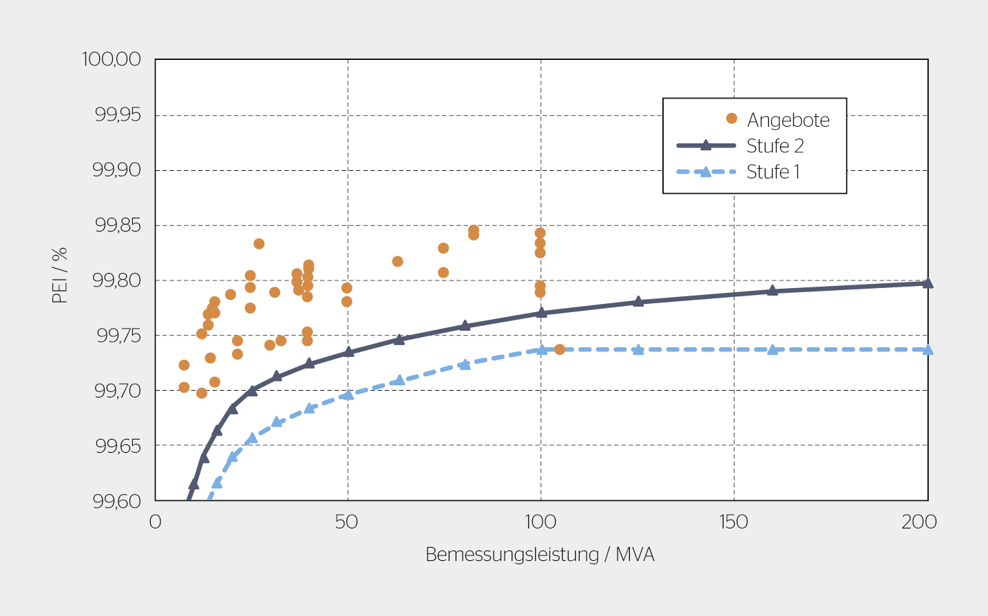Zur Analyse der Situation bei GLT haben wir alle in den Jahren 2018 bis 2019 an Schweizer Kunden angebotenen Transformatoren eines Herstellers herangezogen. Dabei zeigt sich, dass alle Trafos bereits den minimalen PEI-Wert der Stufe 2 erfüllen (Bild 1), mit Ausnahme eines Trafos, der noch für Stufe 1 ausgelegt war.