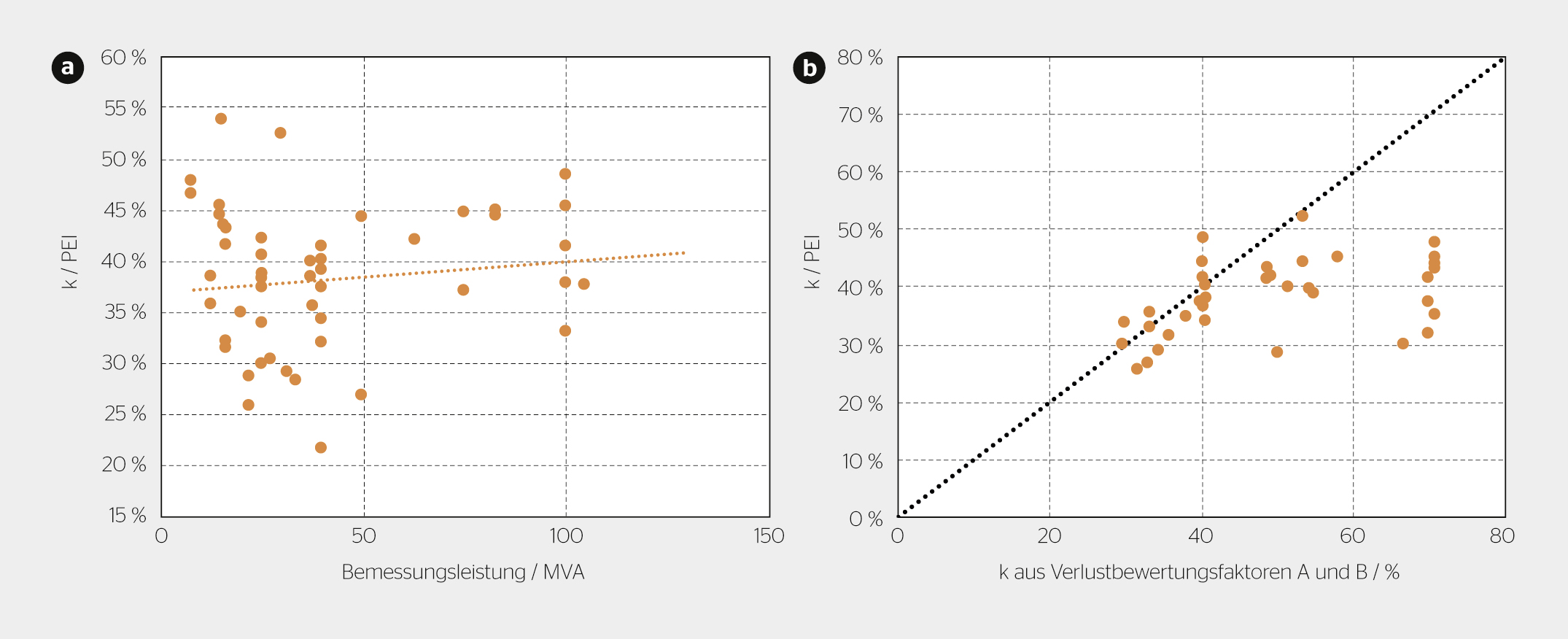 Bild 2b zeigt einen Vergleich des Lastfaktors, der sich aus den Verlusten der Trafos ergibt, mit demjenigen, der sich aus den Verlust-Bewertungsfaktoren A und B ergibt. Aus einer reinen Verlustperspektive wären diese idealerweise in etwa identisch und würden auf der gestrichelten Linie liegen. Dies berücksichtigt aber die Abhängigkeit der Herstellkosten von Kernblech und Kupfer nicht. Nimmt man an, dass die Betreiber die Belastung des Trafos einigermassen kennen und die A- und B-Faktoren realistisch berechnet sind und dass nicht eine starke Zunahme der Auslastung über die Jahre erwartet wird, sollten die Trafos im Schnitt mit leicht tieferen Lastverlusten dimensioniert werden.