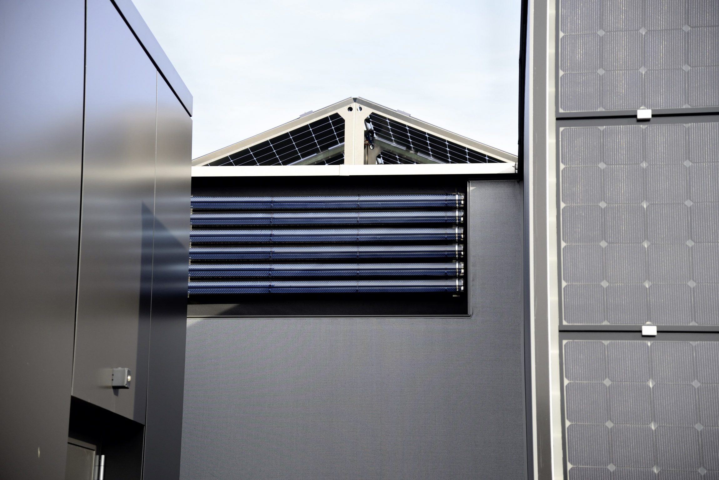 Die meiste Energie wird auf dem Dach erzeugt, mit PV-Anlagen und thermischen Kollektoren. Die Fitness-Unit hat zudem in die Fenster integrierte Solarpanels zur Stromerzeugung und Verschattung. Bei starker Sonneneinstrahlung wird so ein angenehmes Raumklima ermöglicht.