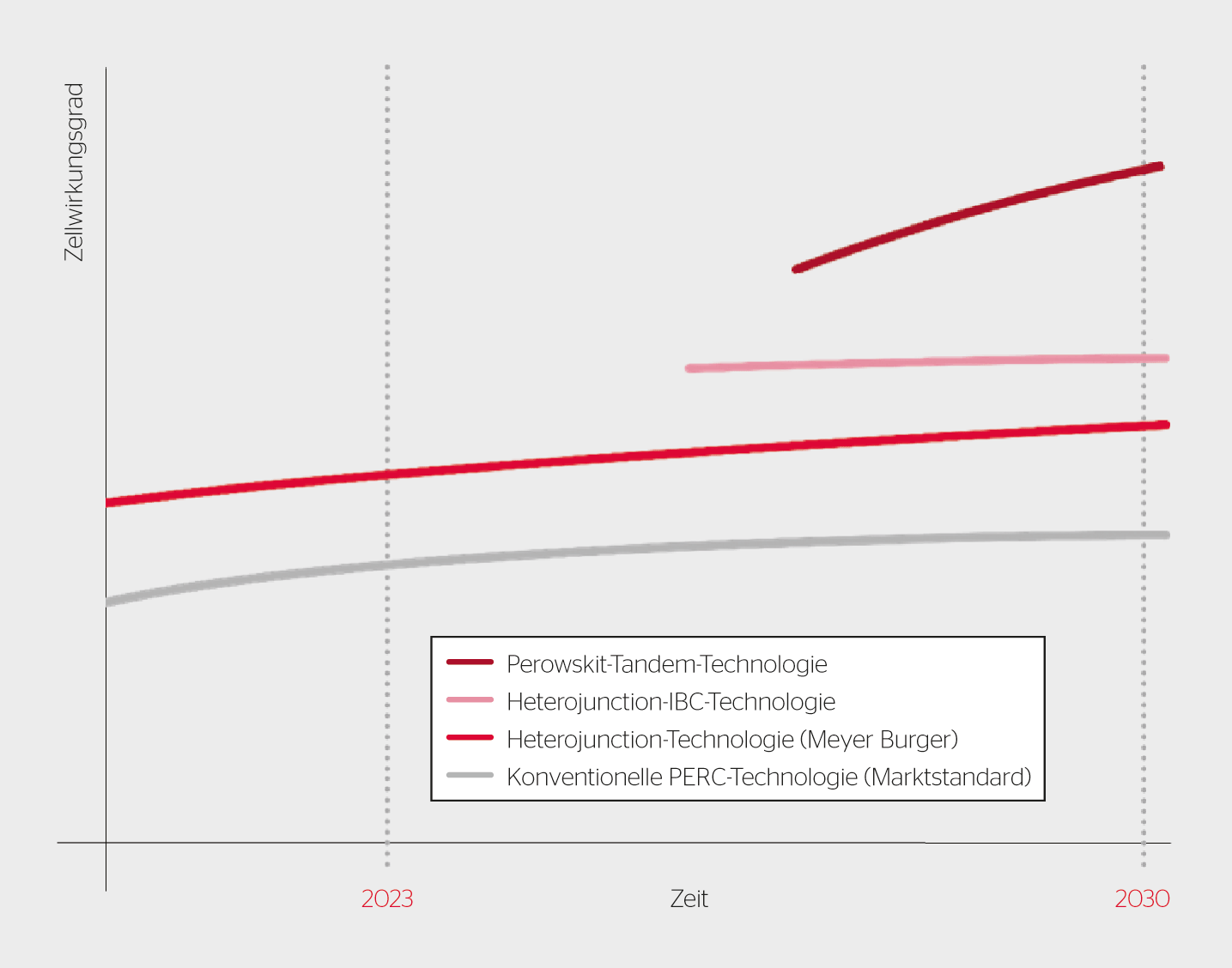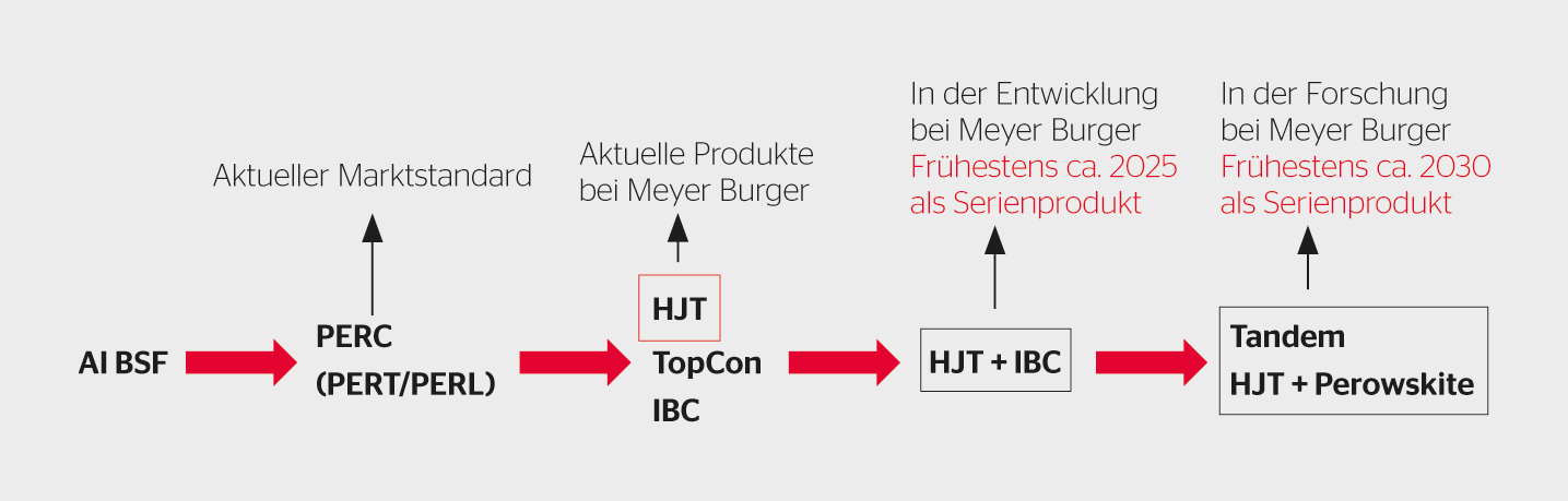 Die nächste Entwicklung wird die Kombination der HJT-Zelltechnologie mit Perowskitzellen sein – ein sogenanntes Tandem. Hier werden die zwei Technologien übereinandergestapelt. Der Unterschied ist, dass die HJT-Zelle eher den roten Lichtbereich und die Perowskitzelle eher den blauen absorbiert. Durch die Kombination beider Zelltechnologien kann das einfallende Lichtspektrum besser ausgenutzt werden, somit sind höhere Zelleffizienzen möglich. Ziel ist es, eine Solarzelle mit einem Wirkungsgrad von über 30% für die industrielle Fertigung zu ermöglichen. Diese nächste Evolutionsstufe ist für die 2030er-Jahre geplant.