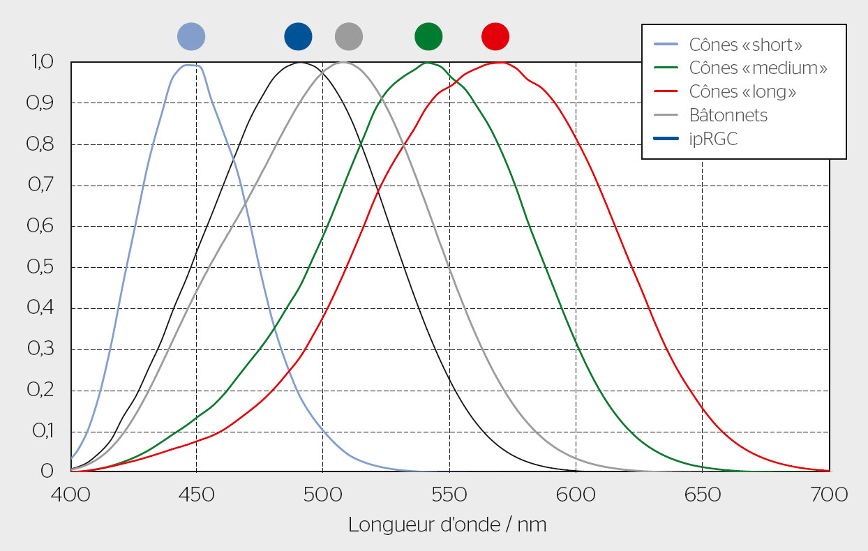 La norme se base sur les spectres d’action actiniques des cinq types de photorécepteurs de l’œil humain: les trois sortes de cônes (short, medium, long), les bâtonnets et les ipRGC. La figure 1 représente les spectres d’action actiniques des ipRGC. Ces cellules possèdent un maximum de sensibilité à 490 nm, soit dans la zone bleu cyan.