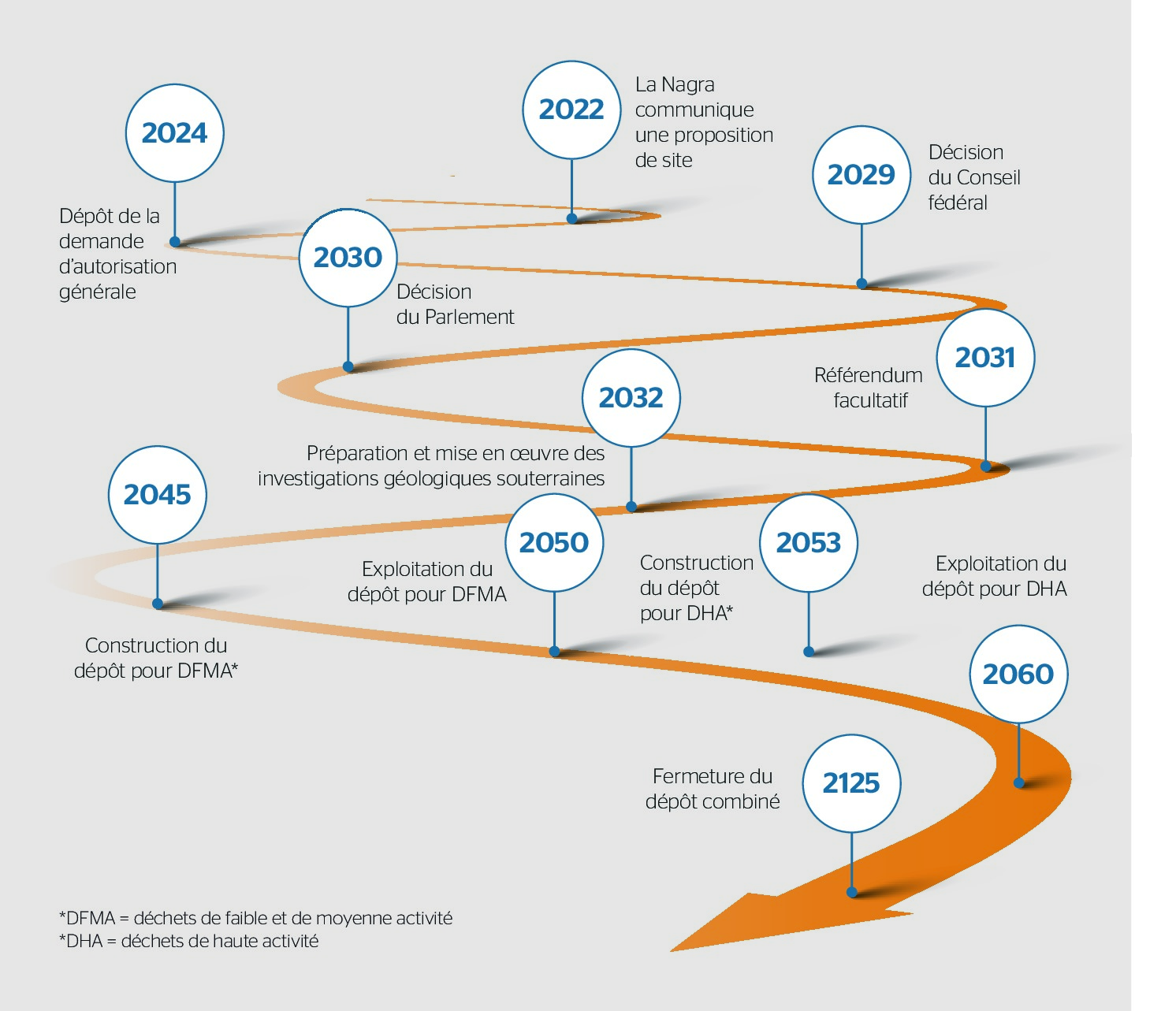 La Nagra va maintenant élaborer une demande d’autorisation générale pour ce site, qu’elle soumettra au Conseil fédéral, probablement en 2024. Le gouvernement rendra sa décision environ cinq ans plus tard (2029), après quoi ce sera au Parlement de statuer (2030). Une fois la demande approuvée par les deux chambres et soumise à une éventuelle votation, de nouvelles études géologiques du sous-sol ainsi que des préparatifs de travaux suivront avant que ne débute en 2045 le chantier du dépôt conçu pour les déchets faiblement à moyennement radioactifs, provenant pour la plupart d’applications industrielles, médicales et de recherche. La mise en service du dépôt est prévue pour 2050. Celui destiné aux déchets hautement radioactifs, dont la construction débutera en 2055, sera opérationnel en 2060. La fermeture de l’ensemble devrait intervenir dans plus d’un siècle, soit en 2125, une date qui semble aujourd’hui futuriste.