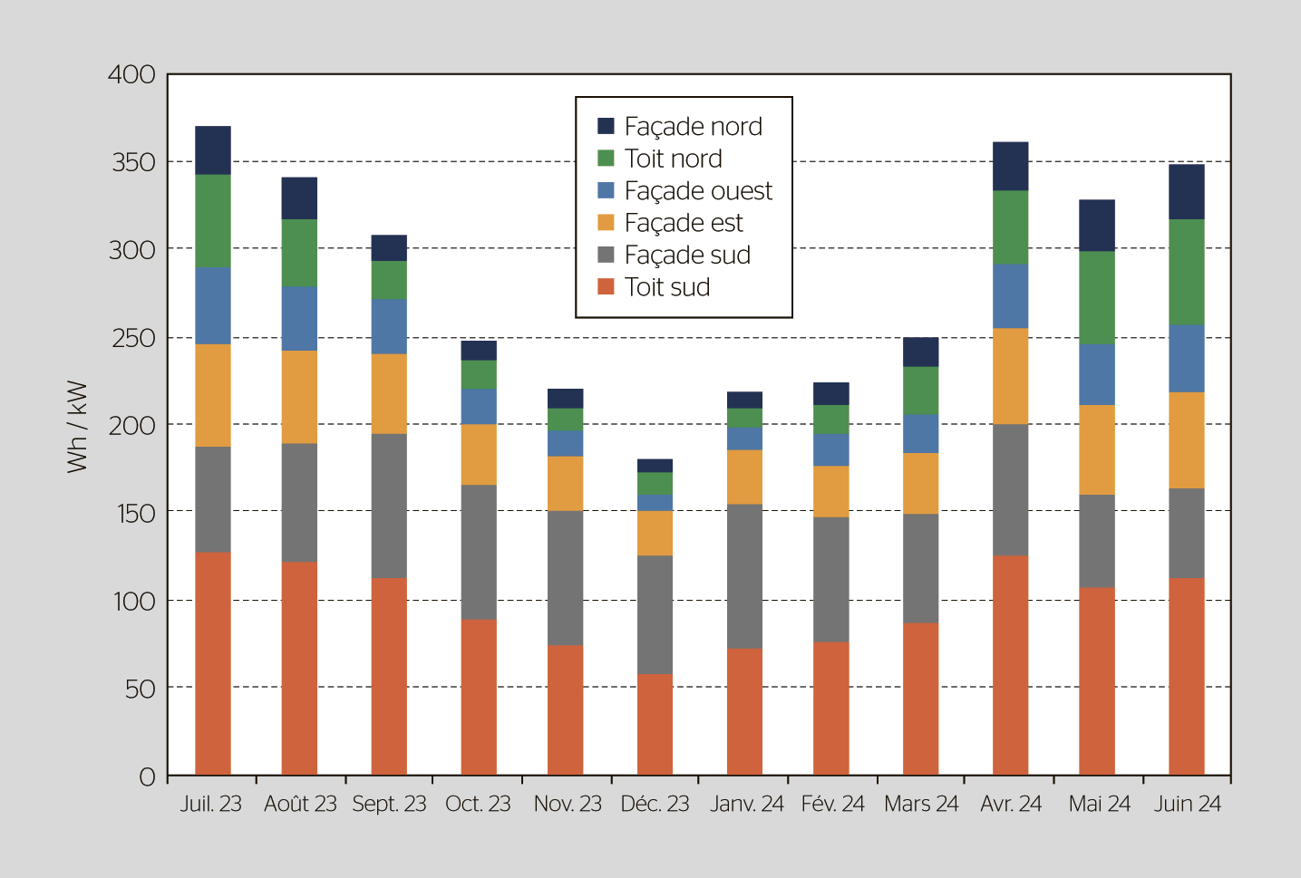 Les panneaux PV n’étant aujourd’hui pas beaucoup plus chers que d’autres systèmes de façade ou de toiture, il était clair que le toit et la façade nord seraient également habillés de cette manière. L’enveloppe uniforme du bâtiment simplifiait la construction tout en renforçant l’expression architecturale globale. Il n’a toutefois pas été évident dès le départ pour le maître d’ouvrage de savoir si cela valait la peine de raccorder ces modules. Finalement, il a été décidé de les utiliser également à des fins énergétiques et de les équiper d’onduleurs. Aujourd’hui, après trois ans, il est clair que c’est surtout le toit nord, très incliné, qui apporte une contribution non négligeable à la production.