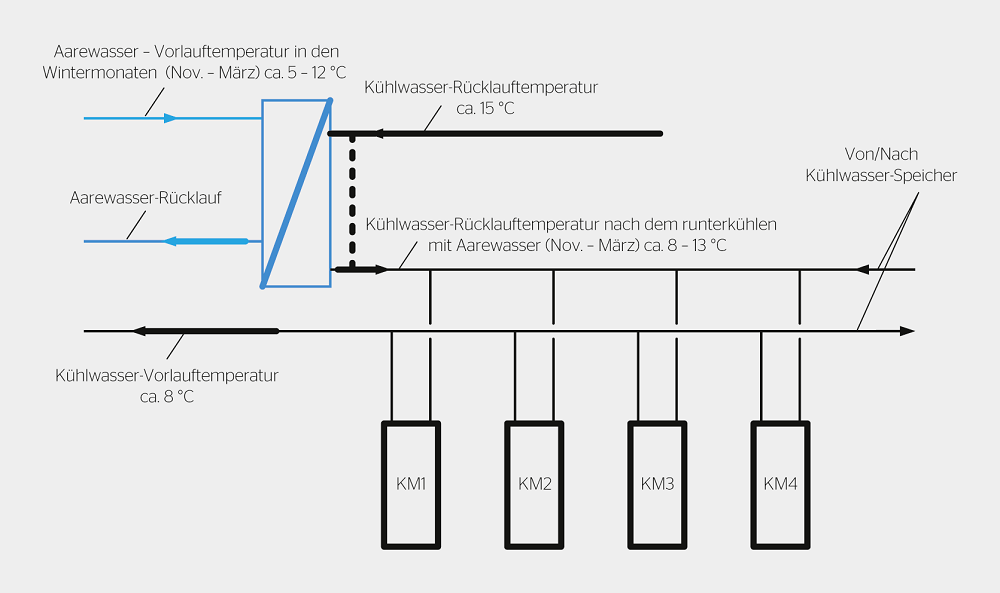 Zur zusätzlichen Energieoptimierung werden die tiefen Temperaturen in den Wintermonaten genutzt, um den Energieverbrauch der Kältemaschinen mittels direkter Aarewasserkühlung weiter zu verringern (indirektes Free Cooling). So hat die Bedag Ende 2016 nachhaltig investiert und zusätzlich zwei Aarewasser-Plattentauscher in den Rücklauf des Kühlwassersystems eingebaut. Damit wird das Wasser im Rücklauf vor dem Eintritt in die Kältemaschinen mit Aarewasser vorgekühlt, wodurch Letztere weniger Kühlarbeit leisten müssen. Die modernisierte Anlage war während der Wintersaison 2017/18 zum zweiten Mal in Betrieb und das Ergebnis überzeugt: