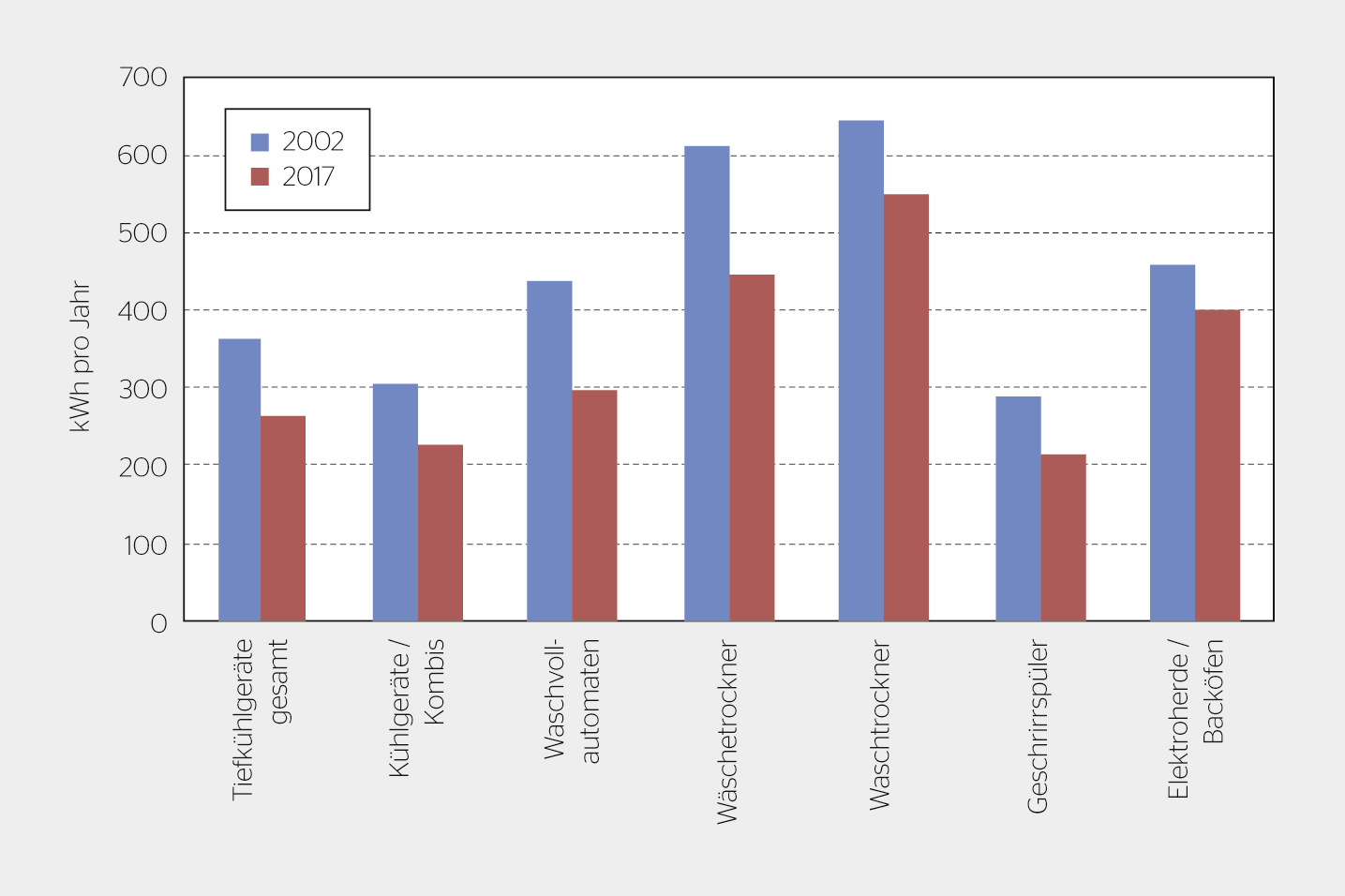 Zu beachten ist ferner, dass die BFE-Grafiken Markt-Gerätedaten von 2002 (bzw. 2000) und 2017 darstellen, während unsere typischen Haushalte von 2011 und 2017 jeweils eine Geräte-Population enthalten (mittleres Gerätealter je nach Typ 2 bis 6 Jahre). Bei vielen Geräten wurde die Effizienz vor allem nach ca. 2010 stark verbessert, womit die grössten Veränderungen tatsächlich im Zeitraum 2011 bis 2017 stattgefunden haben.