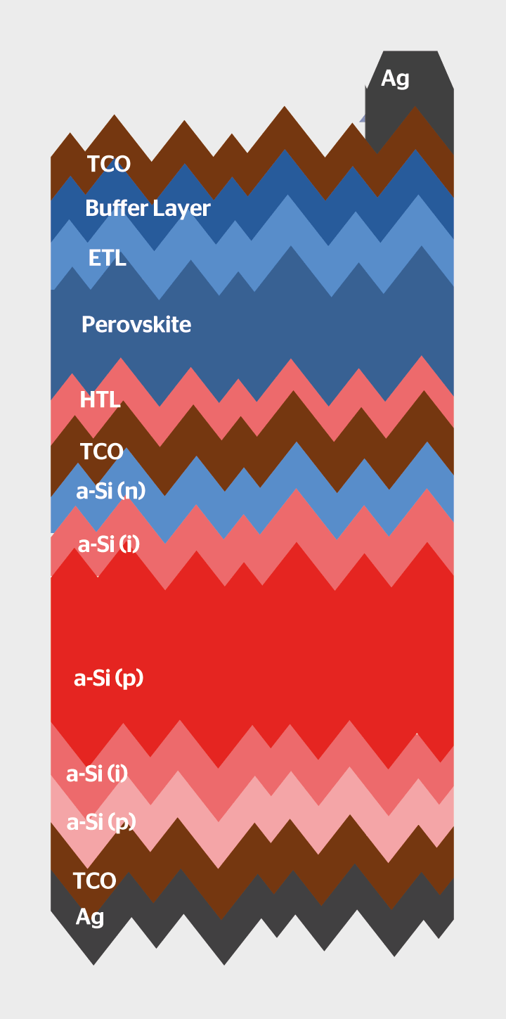 Als zweite absorbierende Schicht bieten sich klassische Silicium-Solarzellen an. Silicium-Solarzellen sind günstig, massenhaft verfügbar und technisch weit entwickelt. Zudem existieren Hersteller, die im Gigawattmassstab produzieren. Silicium-Solarzellen haben mittlerweile einen Marktanteil von rund 95%. Die Fähigkeit, einen hohen Wirkungsgrad bei der Energieumwandlung zu erzielen, und niedrige Degradationsraten waren entscheidende Faktoren für diese Erfolgsgeschichte. Sowohl mit den Solarzellen an sich als auch mit deren Herstellungsverfahren konnte die PV-Industrie über Jahrzehnte hinweg Erfahrungen sammeln. Es ergibt Sinn, eine Weiterentwicklung der Solarzellentechnologie auf diesem Erfahrungsschatz aufzubauen.