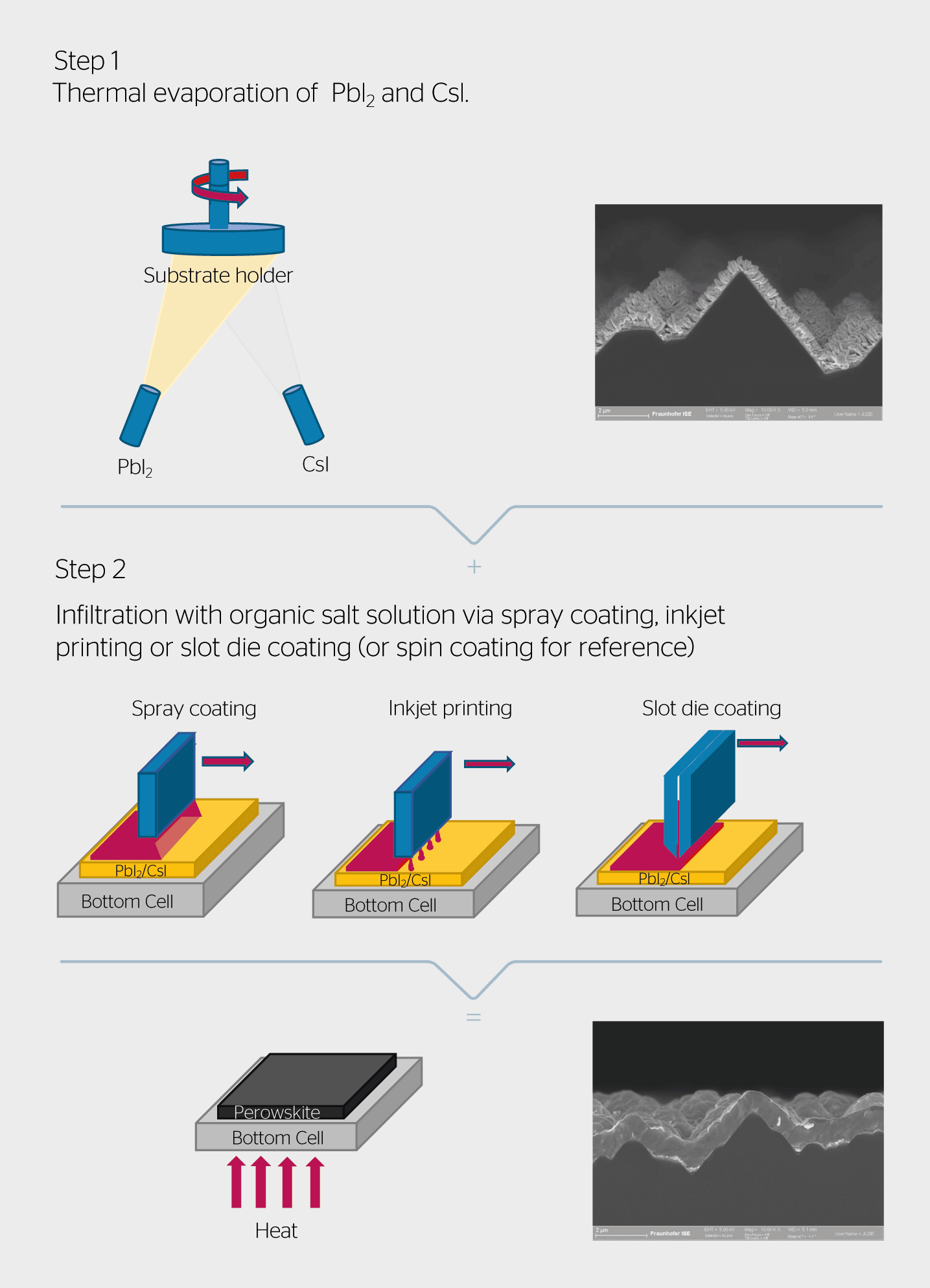 Für die Herstellung der Laborzellen mit einem Quadratzentimeter Fläche ist die am häufigsten verwendete Methode bislang das nasschemische Spin-Coating. Das Verfahren ist vielseitig, aber auf kleine Flächen beschränkt. Die Alternative Schlitzdüsen-Beschichtung hat den Nachteil, dass bei der Beschichtung von texturiertem Silicium die Textur im Wesentlichen aufgefüllt und die Perowskit-Oberfläche meist eingeebnet wird. Das verschlechtert die Lichtausbeute.