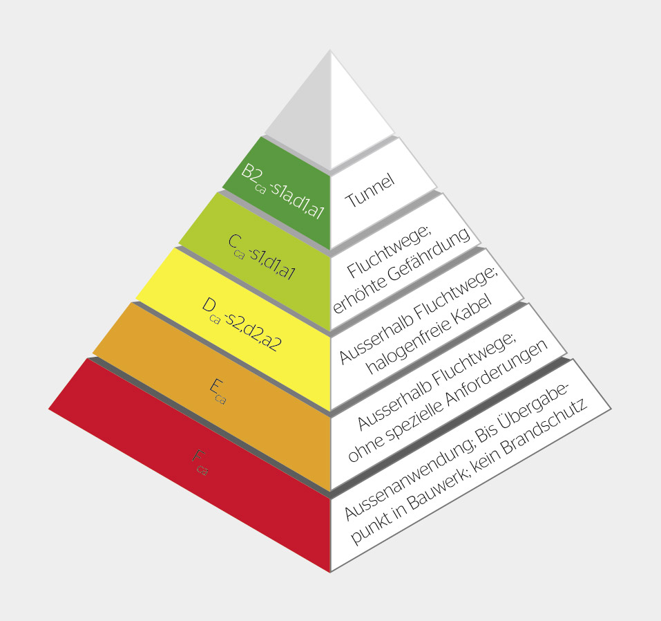 Für Kabel ist der Bereich B2ca (sehr hohes Sicherheitsniveau) bis Fca (keine Brandschutzanforderung) wichtig. Aca ist nur für mineralische Baustoffe geeignet.