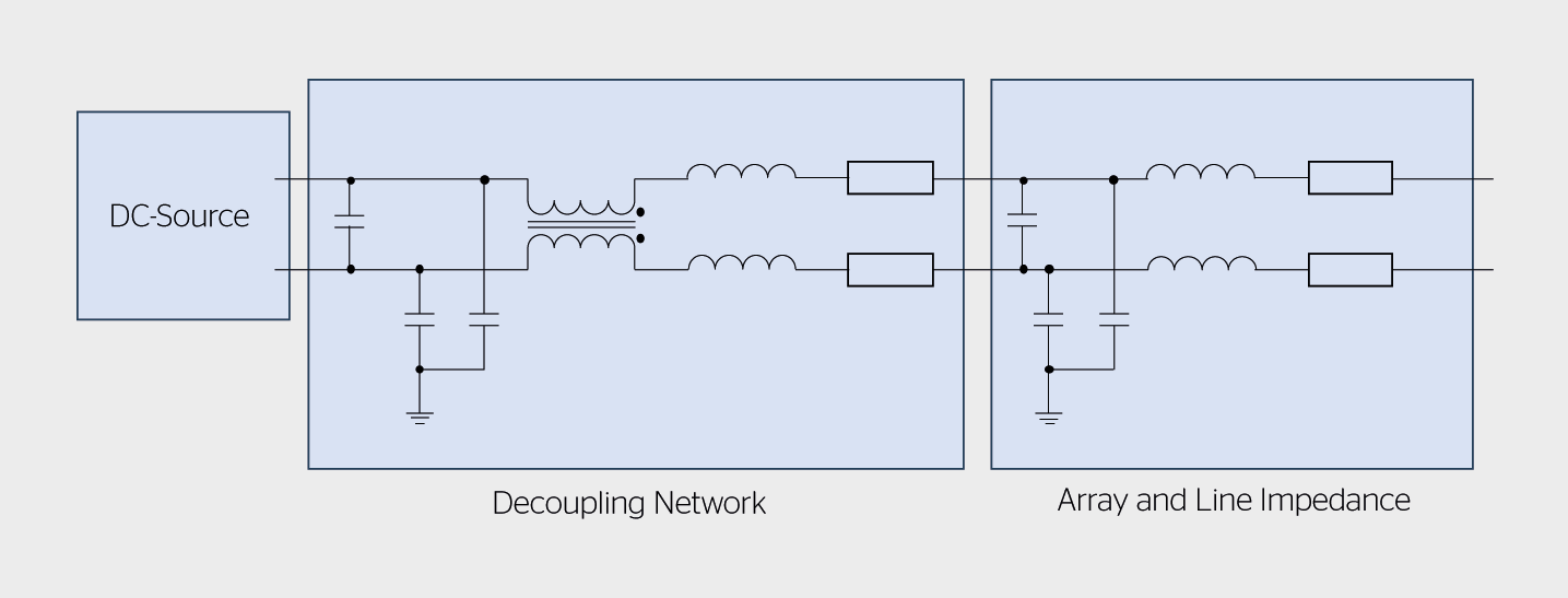 Im Labor werden zur Prüfung von Lichtbogendetektoren statt PV-Modulen sogenannte Kennliniensimulatoren verwendet, also DC-Quellen, welchen die Charakteristik eines PV-Moduls einprogrammiert wird. Verglichen mit PV-Modulen haben sie architekturbedingt meist eine hohe Kapazität gegenüber dem Erdpotenzial, die zu Verfälschungen der Lichtbogendetektion in den Wechselrichtern führen kann. Ein sogenanntes «Decoupling Network» (Bild 1) wird zur Kompensation dieser unerwünschten Einflüsse zwischen DC-Quelle und Wechselrichter geschaltet [1]. Die Tests der Lichtbogendetektoren erfolgen bei verschiedenen Systemströmen für Serielichtbögen an unterschiedlichen Positionen im Strang. Die zu überprüfenden Kriterien sind die Energie und die Zeit bis zur Löschung respektive Meldung des Lichtbogens.