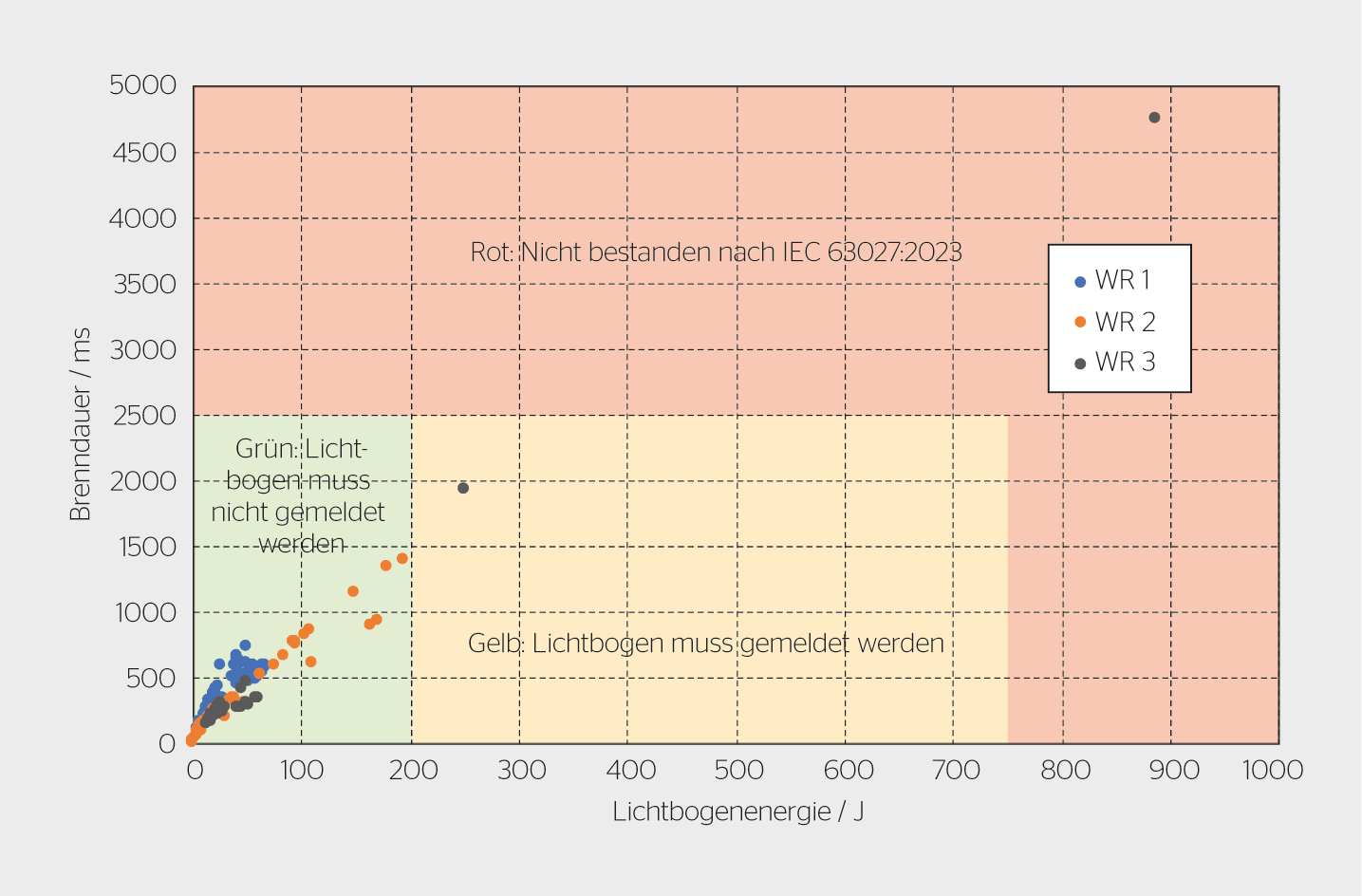 Wechselrichter müssen Lichtbögen nach IEC 63027:2023 innerhalb von 2,5 s oder bevor die Lichtbogenenergie 750 J erreicht, löschen – je nachdem, was früher eintritt. Das Gerät muss dabei immer eine entsprechende Fehlermeldung verschicken, ausser wenn der Lichtbogen rechtzeitig erlöscht, bevor die Lichtbogenenergie 200 J überschreitet. In diesem Fall muss der Lichtbogen nicht gemeldet werden [1] (Bild 2).