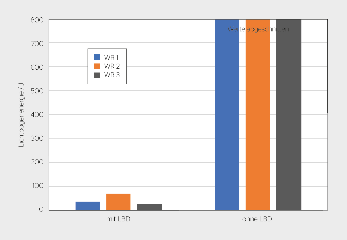 Etwas anders sehen die Testresultate aus, wenn abweichend zu den normativen Vorgaben lange Kabel in den Testaufbau integriert werden. Vom PV-Labor wurden arbiträr 20 m Kabellänge gewählt, die zur Erhöhung der Induktivität lose aufgerollt in den Laboraufbau integriert wurden. Damit wird die Induktivität deutlich längerer Leitungen nachgebildet. Die gemessenen Lichtbogenenergien in Bild 4 zeigen nun, dass nur noch ein Wechselrichter alle Lichtbögen erkannt respektive gelöscht hat, während sie bei den anderen Wechselrichtern je nach Lichtbogenposition nicht mehr detektiert werden konnten.