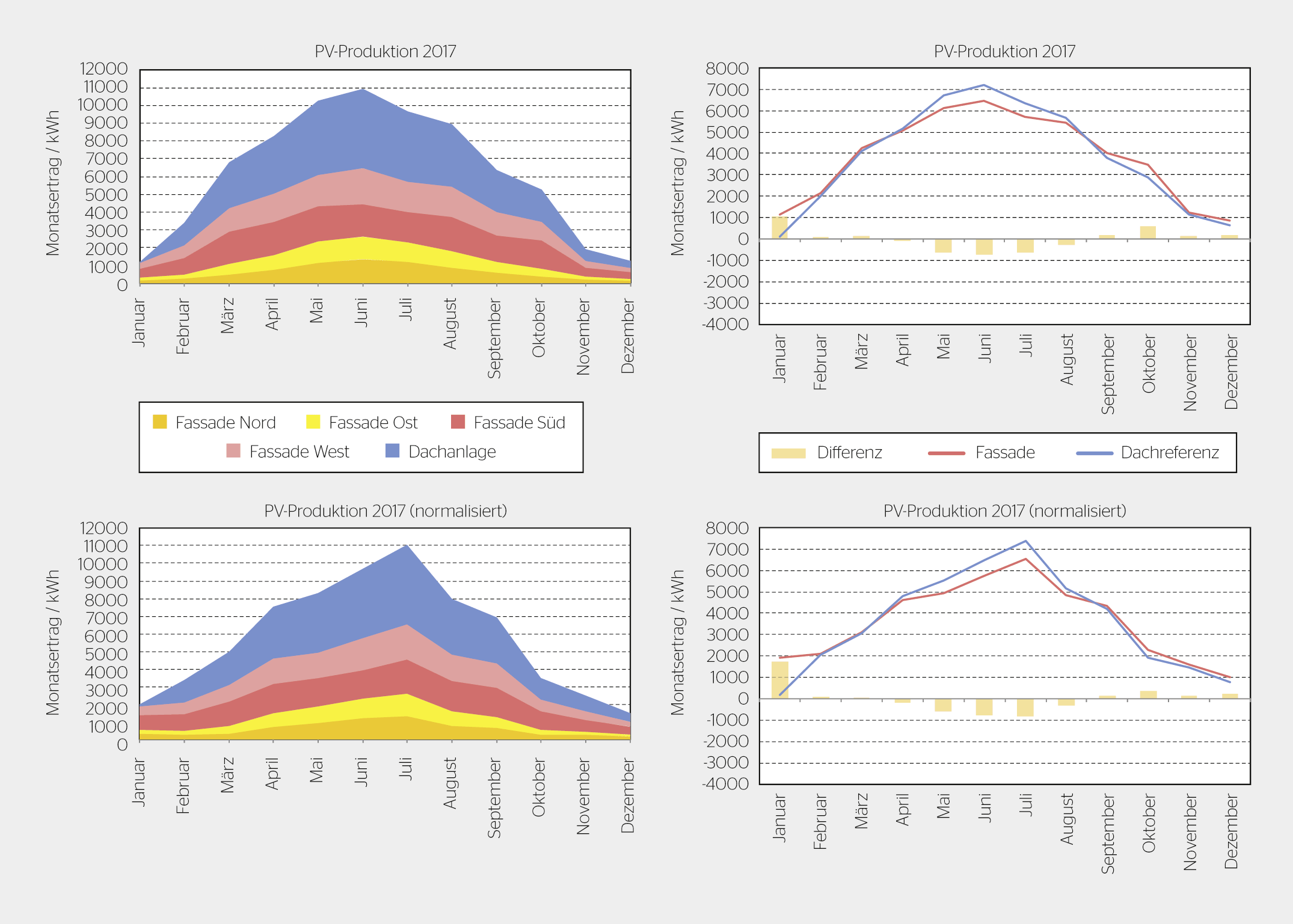 Obenstehendes Bild zeigt gut, dass die Fassadenanlage im Jahresverlauf im Vergleich zur Dachanlage einen gleichmässigeren Ertrag bereitstellt. In den Grafiken rechts wird die Fassadenanlage mit einer ertragsgleichen Dachanlage verglichen. Die Normalisierung auf ein mittleres Jahr erfolgte auf der Basis der jährlichen Sonnenstunden.